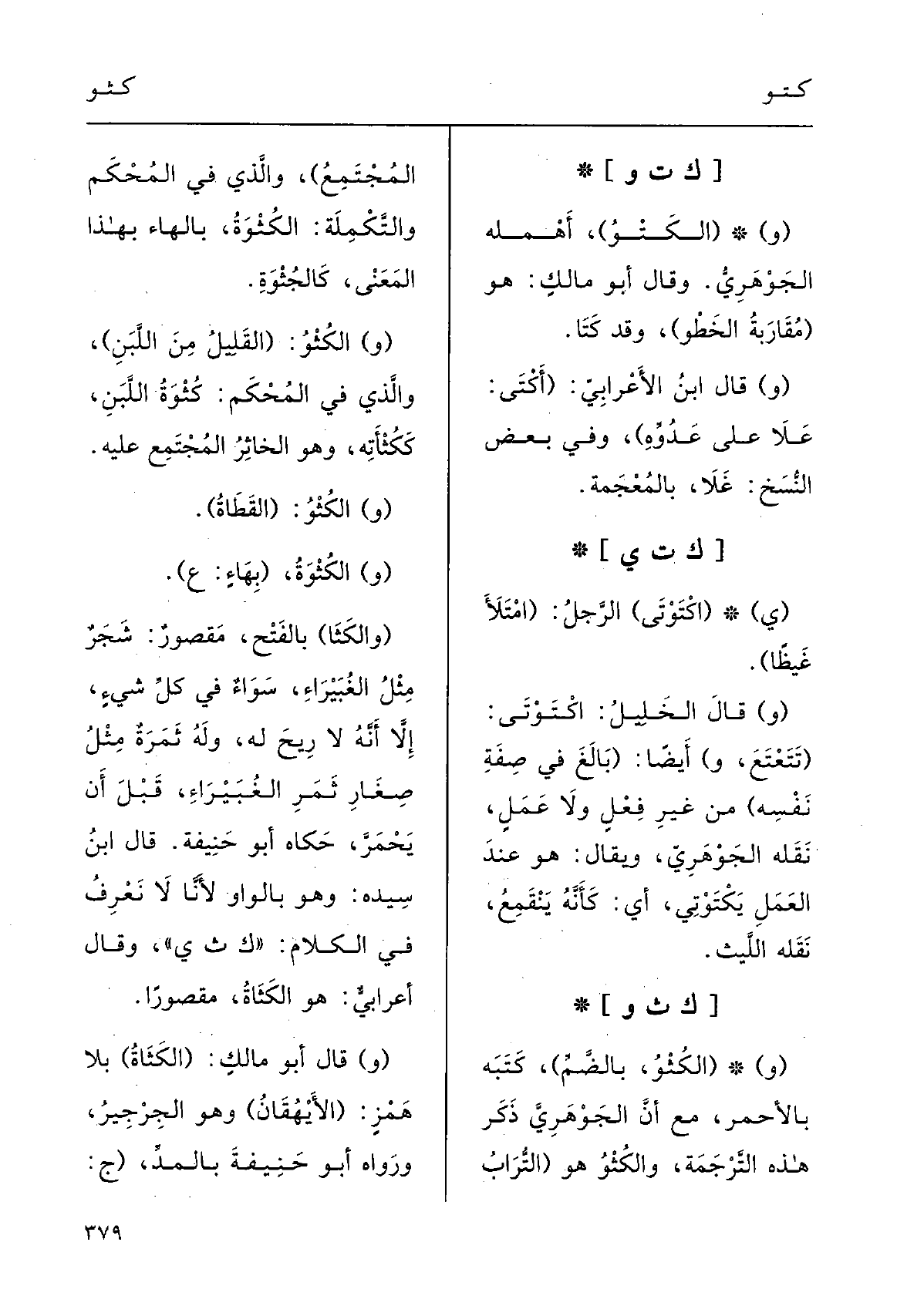 قالَ ابنُ سِيدَه: وَهُوَ بالواوِ لأنَّا لَا نَعْرف فِي الكَلامِ كثي؛ وقالَ أعْرابيٌّ هُوَ الكَثَاةُ، مَقْصوراً.
