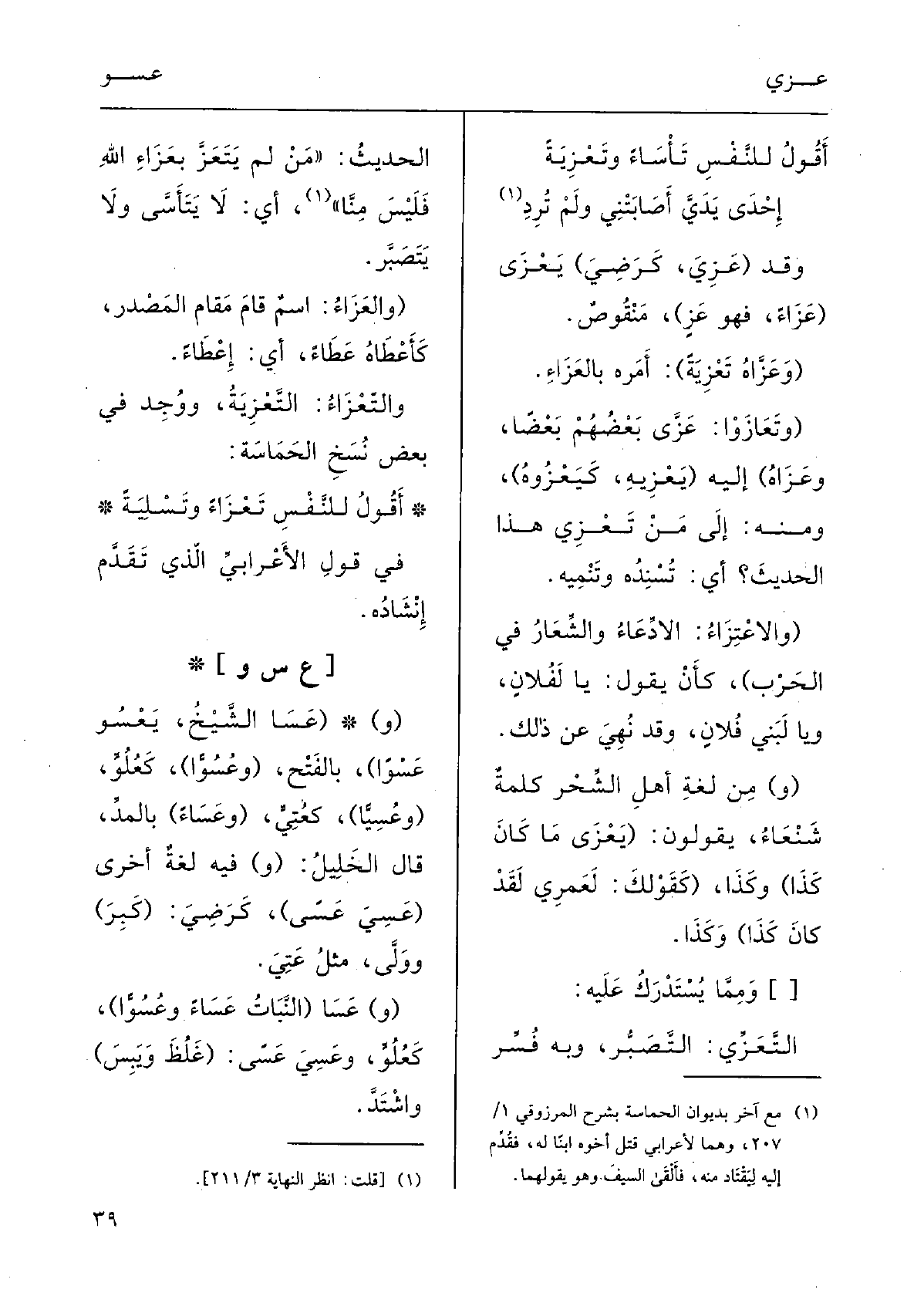} والتّعْزاءُ: {التَّعْزِيَةُ. ووُجِدَ فِي بعضِ نسخِ الحماسَةِ: