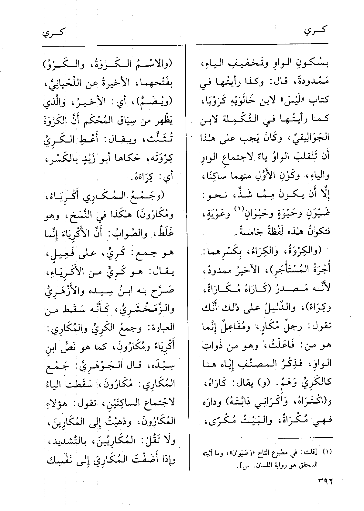 قالَ الجَوْهَرِي: جَمْعُ} المُكارِي {مُكارُونَ، سَقَطَتِ الياءُ لاجْتِماعِ الساكِنَيْن، تقولُ: هؤلاءُ} المُكارُونَ، وَذَهَبْتُ إِلَى المُكارِينَ، وَلَا تَقُل المُكَارِيِّين، بالتَّشْدِيدِ، وَإِذا أَضَفْتَ! المُكارِي إِلَى نَفْسِك