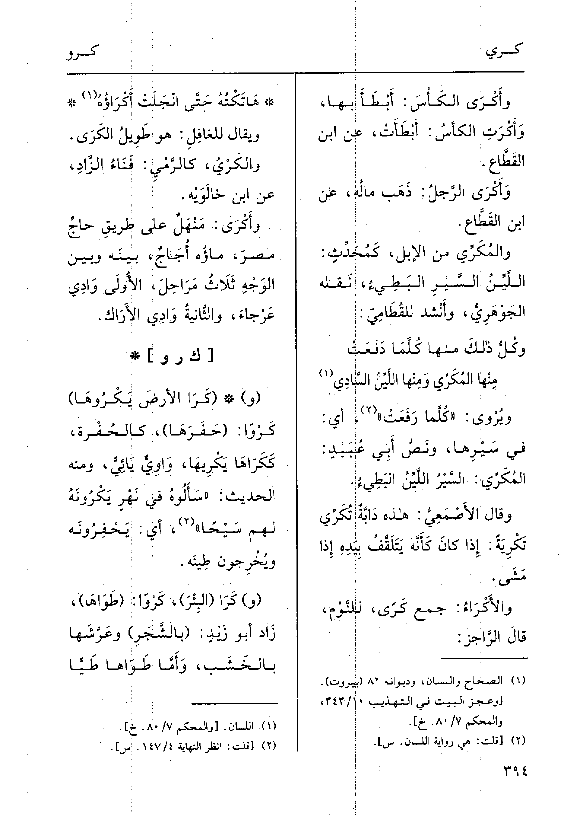 : (و (} كَرَا الأرضَ {يَكْرُوها) } كَرْواً: (حَفَرَهَا) كالحُفْرةِ {ككراها يكْرِيها، واوِيٌّ يائِيٌّ؛ وَمِنْه الحديثُ: (سَأَلُوهُ فِي نَهْرٍ} يَكْرُونَه لَهُم سَيْحاً) ؛ أَي يَحْفِرُونَه ويُخْرِجُون طِينَه.