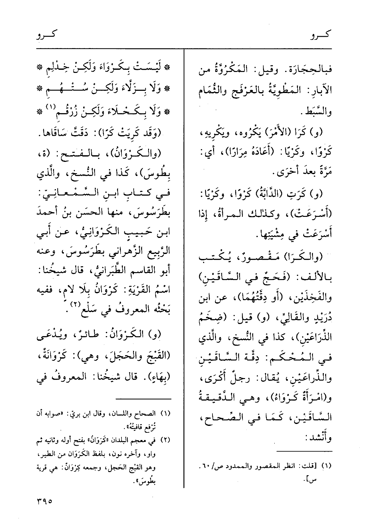 وقيلَ: {المَكُرُوَّةُ مِن الآبارِ المَطْوِيَّةُ بالعَرْفَج والثُّمام والسَّبَط.) (و) } كَرَا (الْأَمر) {يَكْرُوه، ويَكْيريه،} كَرْوًا، وكريا: أَعَادَهُ مرَارًا، أَي مرّة بعد أُخْرَى، {وكَرَتِ (الدَّابَّة) } كَرْوًا وكريا: أسرعت وَكَذَلِكَ الْمَرْأَة، إِذا أسرعت فِي مشيتهَا، {والكَرَا مَقْصُور يكْتب بِالْألف (فحج السَّاقَيْن) والفخذين أَو دقتهما عَن أبن دُرَيْد والقالي وَقيل ضخم الذراعين كَذَا فِي النّسخ وَالَّذِي فِي الْمُحكم: دقة الساعدين والذراعين، يُقَال رجل} أَكْرِى وإمراة {كَرْوَاءُ، وَهِي الدقيقة السَّاقَيْن، كَمَا فِي الصِّحَاح وَأنْشد: لَيست} بِكَرْواءَ وَلَكِن خدلم وَلَا بزاء وَلَكِن ستهم وَلَا بكحلاء وَلَكِن زرقم (وَقد {كَرَيَتْ} كَرًا) دقَّتْ ساقاها. دَقَّتْ سَاقَاها.