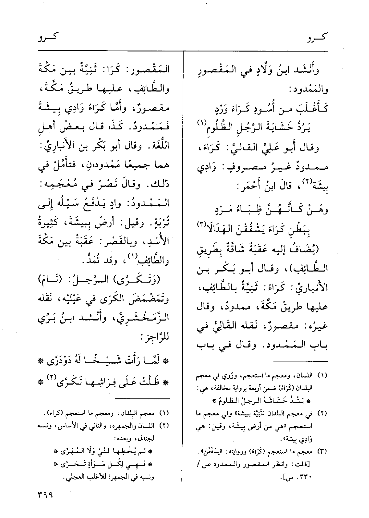 وقالَ غيرُهُ: مَقْصورٌ؛ نقلَهُ القالِي فِي بابِ المَمْدودِ؛ وقالَ فِي بابِ المَقْصورِ:} كَرَاء ثنيَّةٌ بينَ مكَّة والطائِفِ عَلَيْهَا طرِيقُ مكَّة، مَقْصور. وأَمَّا {كَراءُ وادِي بيشَةَ فمَمْدودٌ، وَكَذَا قالَ بعضُ أَهْلِ اللغَةِ.