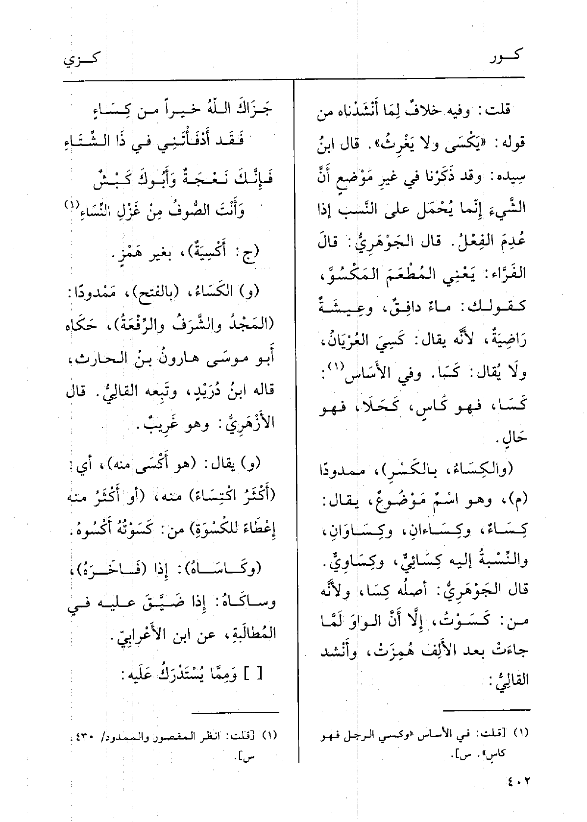 (} والكِساءُ، بالكسْرِ) مَمْدوداً (م) وَهُوَ اسْمٌ مَوْضوعٌ يقالُ {كِساءٌ} وكساءان {وكِساوانِ، والنِّسْبَةُ إِلَيْه} كِسِائِيٌّ {وكِساوِيٌّ. قالَ الجَوْهرِي: أَصْلُه كِساوٌ لأنَّه من} كَسَوْتُ إلاَّ أَنَّ الواوَ لمَّا جاءَتْ بَعْدَ الأَلِفِ هُمِزَتْ؛ وأَنْشَدَ القالِي: