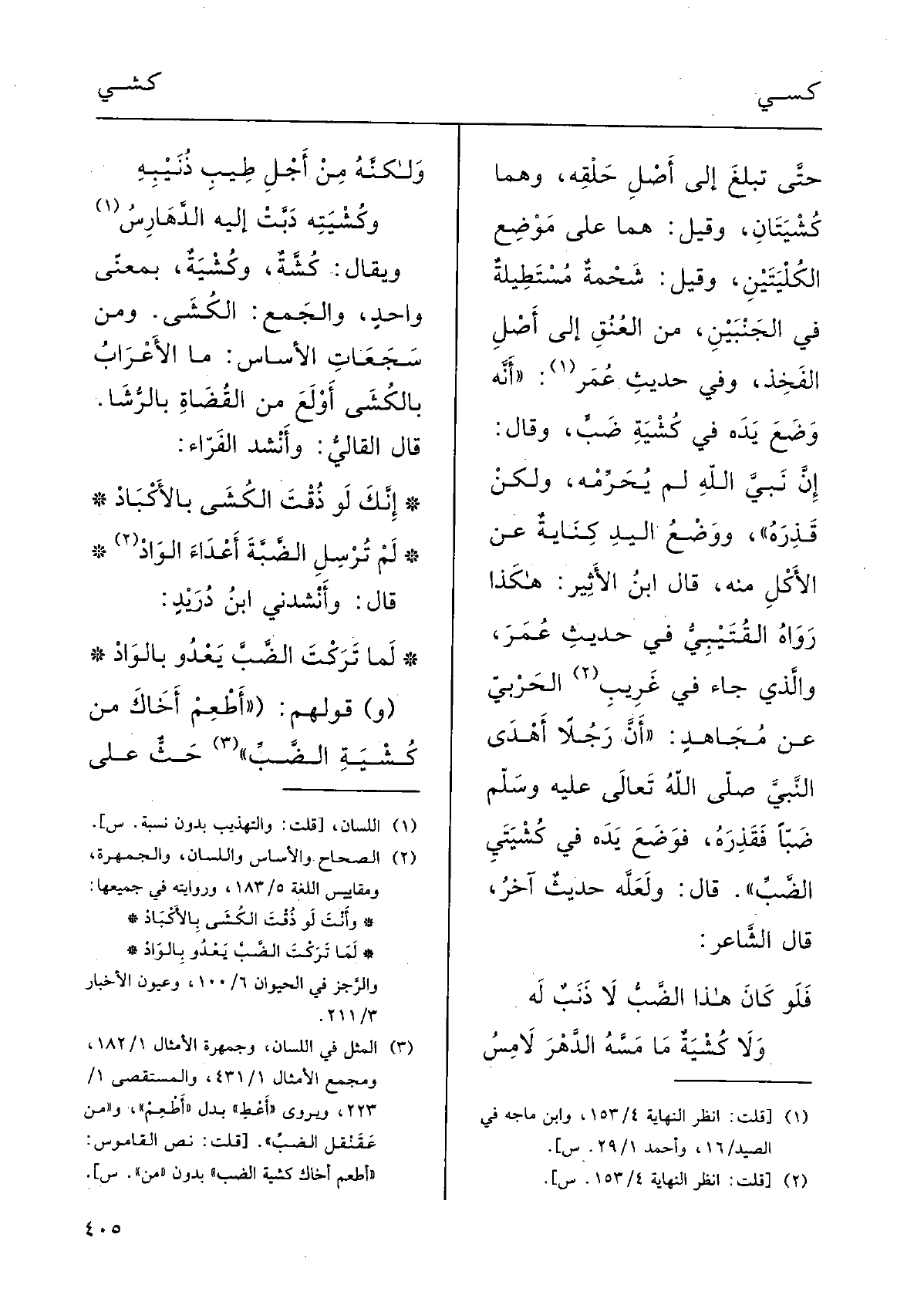 وَفِي حديثِ عُمَر: أَنَّه وَضَعَ يَدَهُ فِي} كُشْيَةِ ضَبَ وقالَ: إنَّ نَبيَّ اللَّهِ لم يُحَرِّمْه وَلَكِن قَذِرَهُ. ووَضْعُ اليَدِ كِنَايَةٌ عَن الأَكْلِ مِنْهُ. قالَ ابنُ الأثيرِ: هَكَذَا رَواهُ القتيبيُّ فِي حديثِ عُمَر، وَالَّذِي جاءَ فِي غرِيبِ الحرْبي عَن مجاهدٍ: أَنَّ رجُلاً أَهْدَى النبيَّ صلى الله عَلَيْهِ وَسلم ضبًّا فقَذِرَهُ فوضَعَ يَدَهُ فِي {كُشْيَتِي الضَّبِّ، قالَ: ولعلَّه حديثٌ آخرُ. قَالَ الشاعرُ: