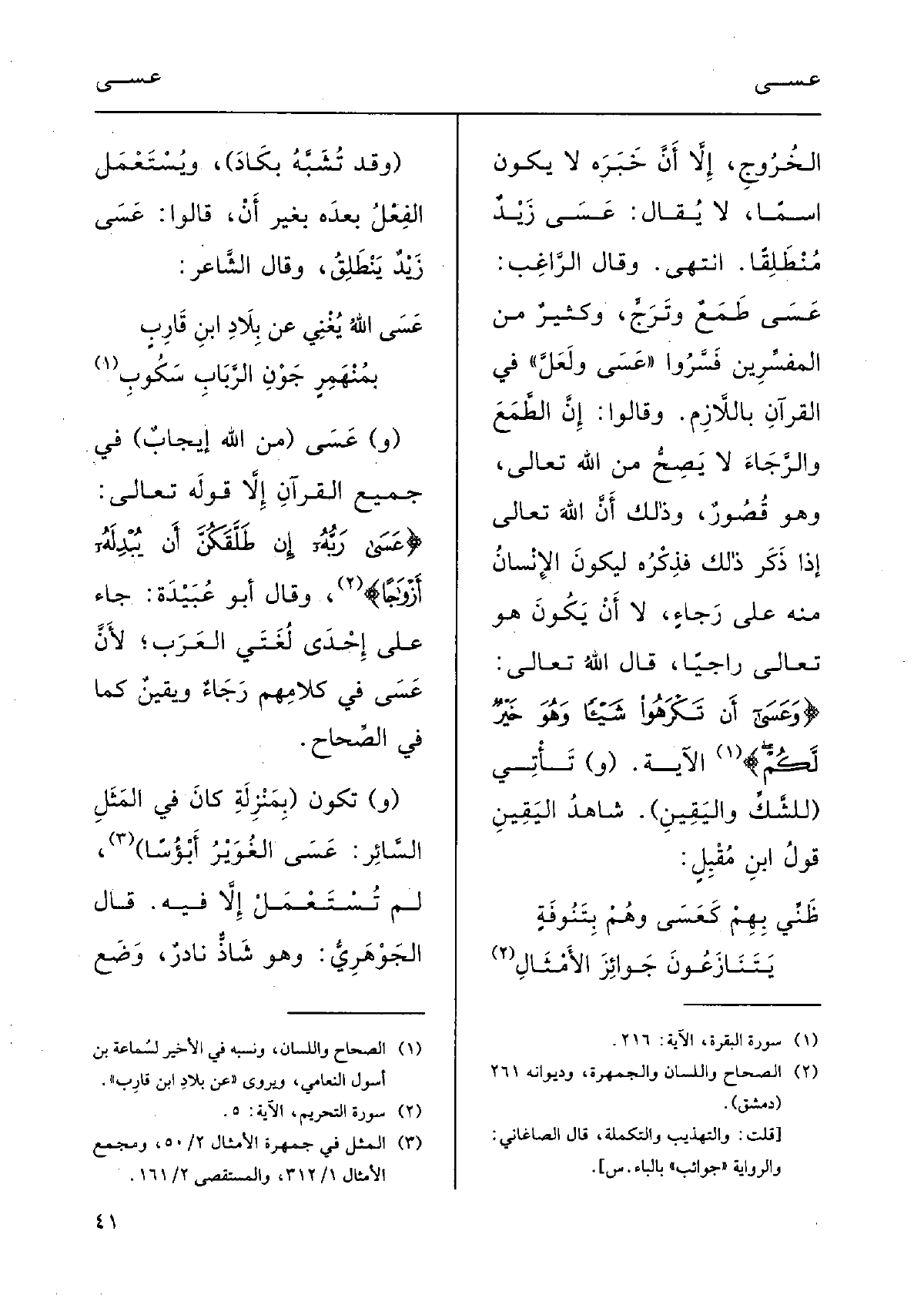 وَقَالَ الراغبُ: عَسَى طَمَعٌ وتَرَجَ، وكثيرٌ مِن المُفَسِّرين فسَّرُوا عَسَى ولعلَّ فِي القُرْآن باللازِمِ وَقَالُوا: إنَّ الطَّمَعَ والرَّجاءَ لَا يصحُّ من اللهِ تَعَالَى، وَهُوَ قُصُورٌ، وَذَلِكَ أنَّ اللهَ تَعَالَى إِذا ذَكَرَ ذلكَ فذَكَرَه ليكونَ الإنْسانُ مِنْهُ على رَجاءٍ، لَا أَن يكونَ هُوَ تَعَالَى راجِياً، قالَ الله تَعَالَى: {عَسَى أَنْ تَكْرَهُوا شَيْئا وَهُوَ خيرٌ لكُم} الآيَة.