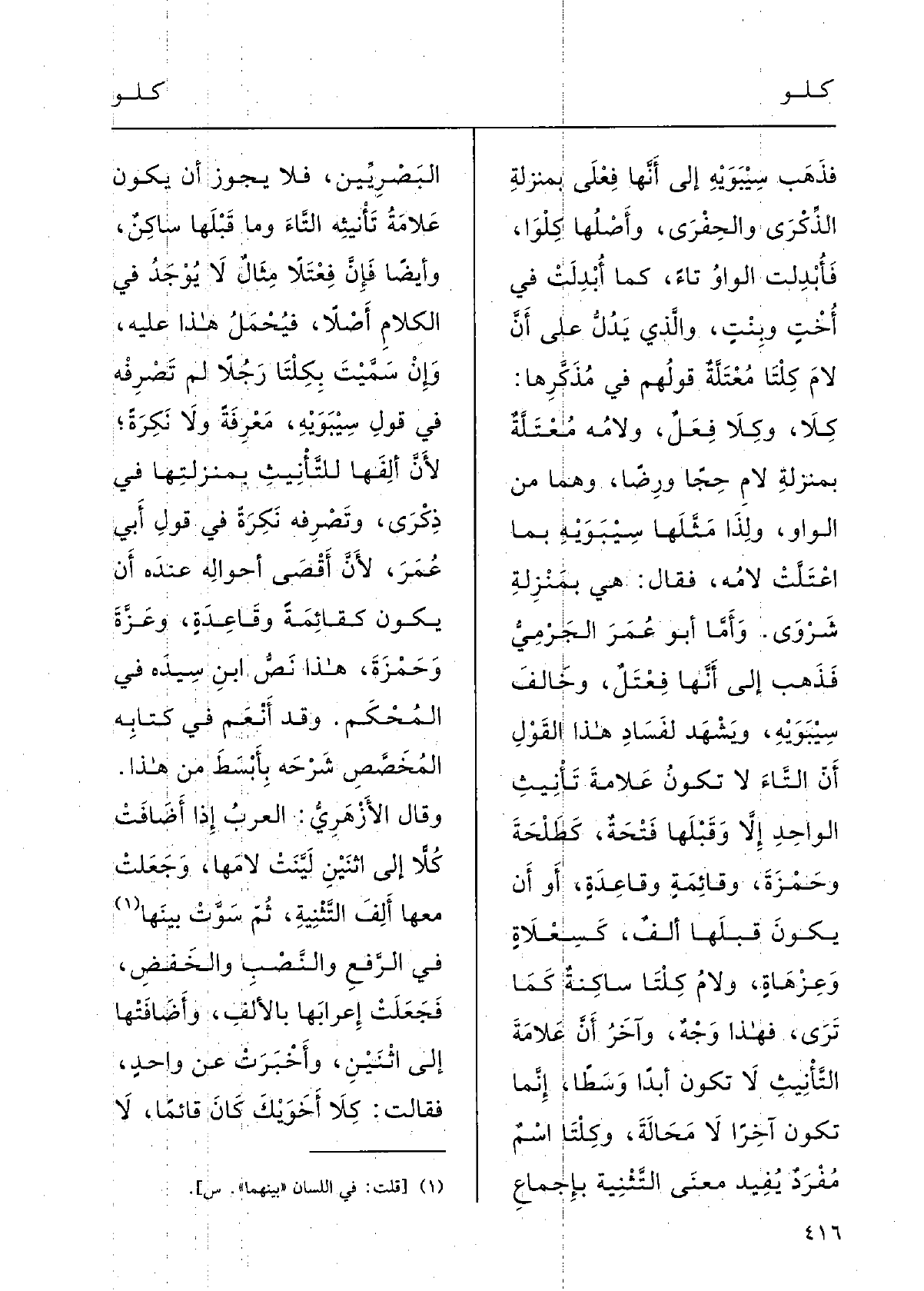 وَقَالَ الأزْهرِي: العَرَبُ إِذا أَضافَتْ كُلاًّ إِلَى اثْنَيْن لَيَّنَتْ لاَمَها وجَعَلَتْ مَعها أَلِفَ التثْنِيَةِ، ثمَّ سَوَّت بَيْنَها فِي الرفْعِ والنصْبِ والخَفْض، فجعلَتْ إعْرابَها بالألِفِ وأَضافَتْها إِلَى اثْنَيْن وأَخْبَرَتْ عَن واحِدٍ، فَقَالَت:} كِلا أَخَوَيْك كَانَ قائِماً، لَا