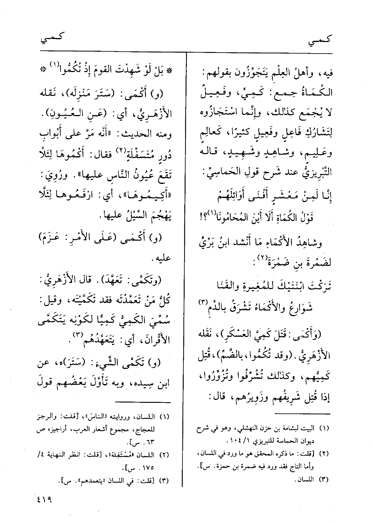 فِيهِ وَأهل الْعلم يتجوزون بقَوْلهمْ: {الكُمَاةُ جمع} كَمِىٍّ، وفعيل لَا يجمع كَذَلِك، وَإِنَّمَا استجازوه لتشارك فَاعل وفعيل كثيرا، كعالم وَعَلِيم وشاهدة وشهيد ة، قَالَه التبريزي عِنْد شرح قَول الحماسي