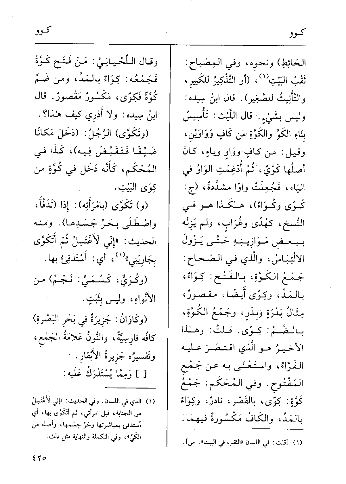قَالَ اللَّيْث: تأْسِيس بِناءِ {الكَوّ} والكَوَّة مِن كافٍ ووَاوَيْن، وقيلَ: مِن كافٍ وواوٍ وياءٍ، كَأَن أَصْلَها كَوًى، ثمَّ أُدْغِمَت الواوُ فِي الياءِ فجُعِلت واواً مُشدَّدةً؛ (ج {كُوًى} وكُواءٌ) ، هَكَذَا هُوَ فِي النُّسخِ كهُدًى وغُرابٍ وَلم يَزنْه ببعضِ مَوازِينِه حَتَّى يَزُولَ الالْتباسُ.
