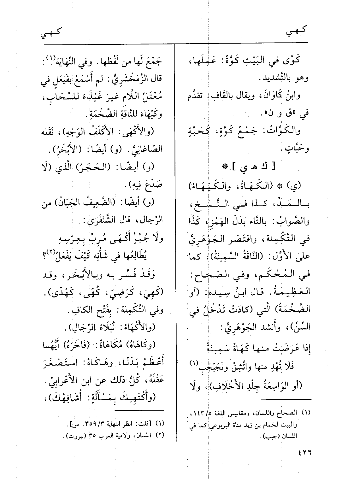 : (ي (} الكَهاةُ {والكَيْهاءُ) ، بالمدِّ؛ كَذَا فِي النُّسخِ والصَّوابُ بالتاءِ بَدَل الهَمْزِ كَذَا فِي التكْمِلَةِ، واقْتَصَر الجَوْهرِي على الأوَّل؛ (النُّاقَةُ السَّمينةُ) ، كَمَا فِي المُحْكم؛ وَفِي الصِّحاح: العَظيمَةُ.