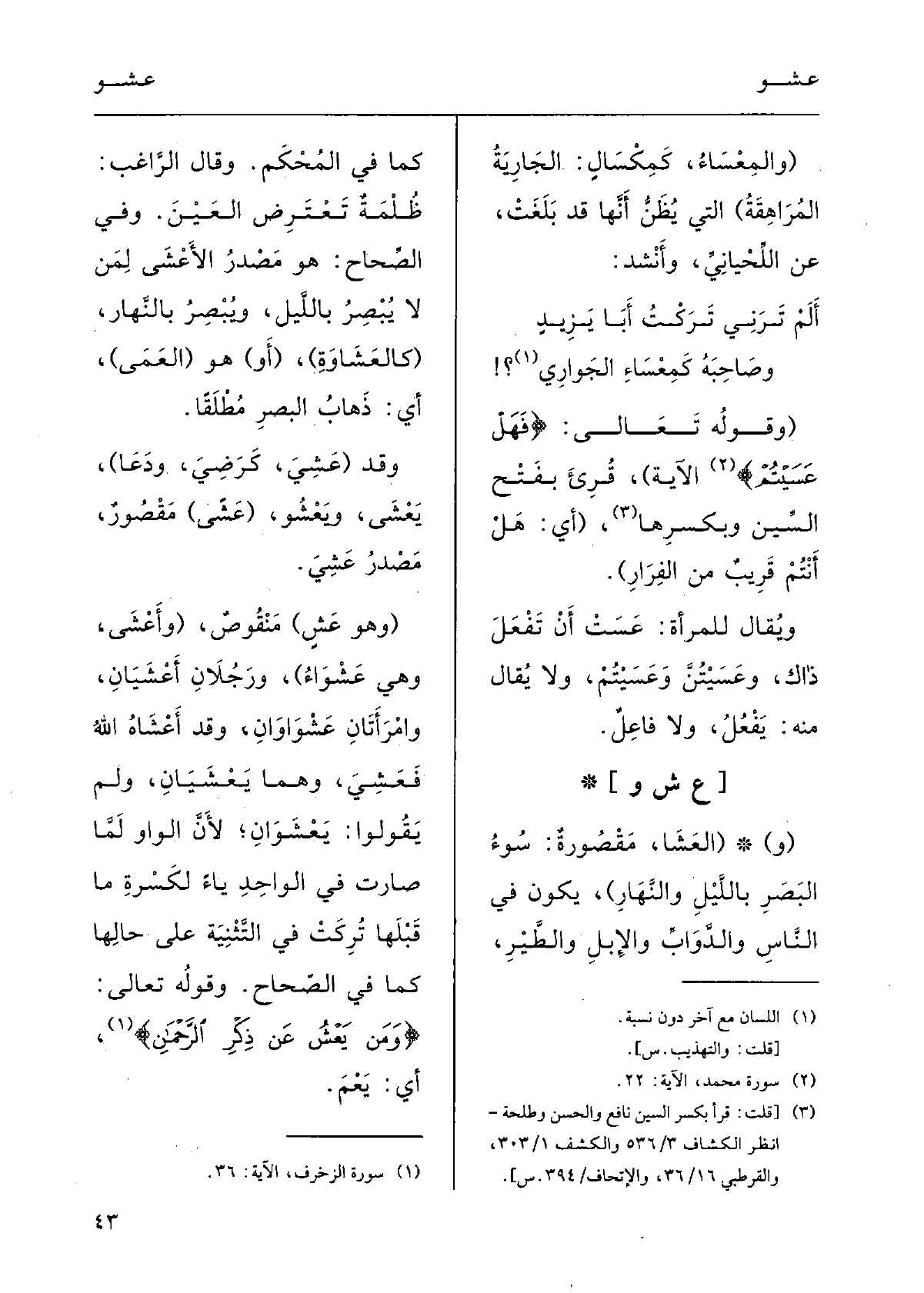 وَقد} أَعْشاهُ اللهُ، {فعَشِيَ، وهما} يَعْشَيانِ، وَلم يَقُولُوا يَعْشَوَانِ، لأنَّ الواوَ لمَّا صارَتْ فِي الواحِدِ يَاء لكَسْرَةِ مَا قَبْلها تُرِكَتْ فِي التَّثْنِيَةِ على حالِها؛ كَمَا فِي الصِّحاح.