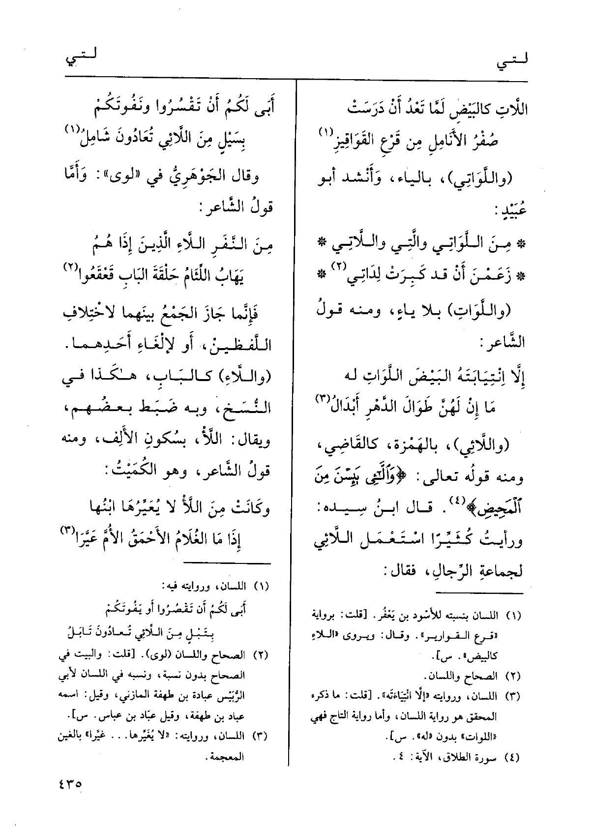 مَا إنْ لَهُنَّ طُوالَ الدَّهْرِ أَبْدالُ (واللاَّئِي) ، بالهَمْزةِ كالقاضِي، وَمِنْه قَوْله تَعَالَى: {واللاَّئِي يَئِسْنَ مِن المَحِيضِ} ، قالَ ابنُ سِيدَه: ورأَيْت كثيرا اسْتَعمَل اللاَّئِي لجماعَةِ الرِّجالِ، فَقَالَ: