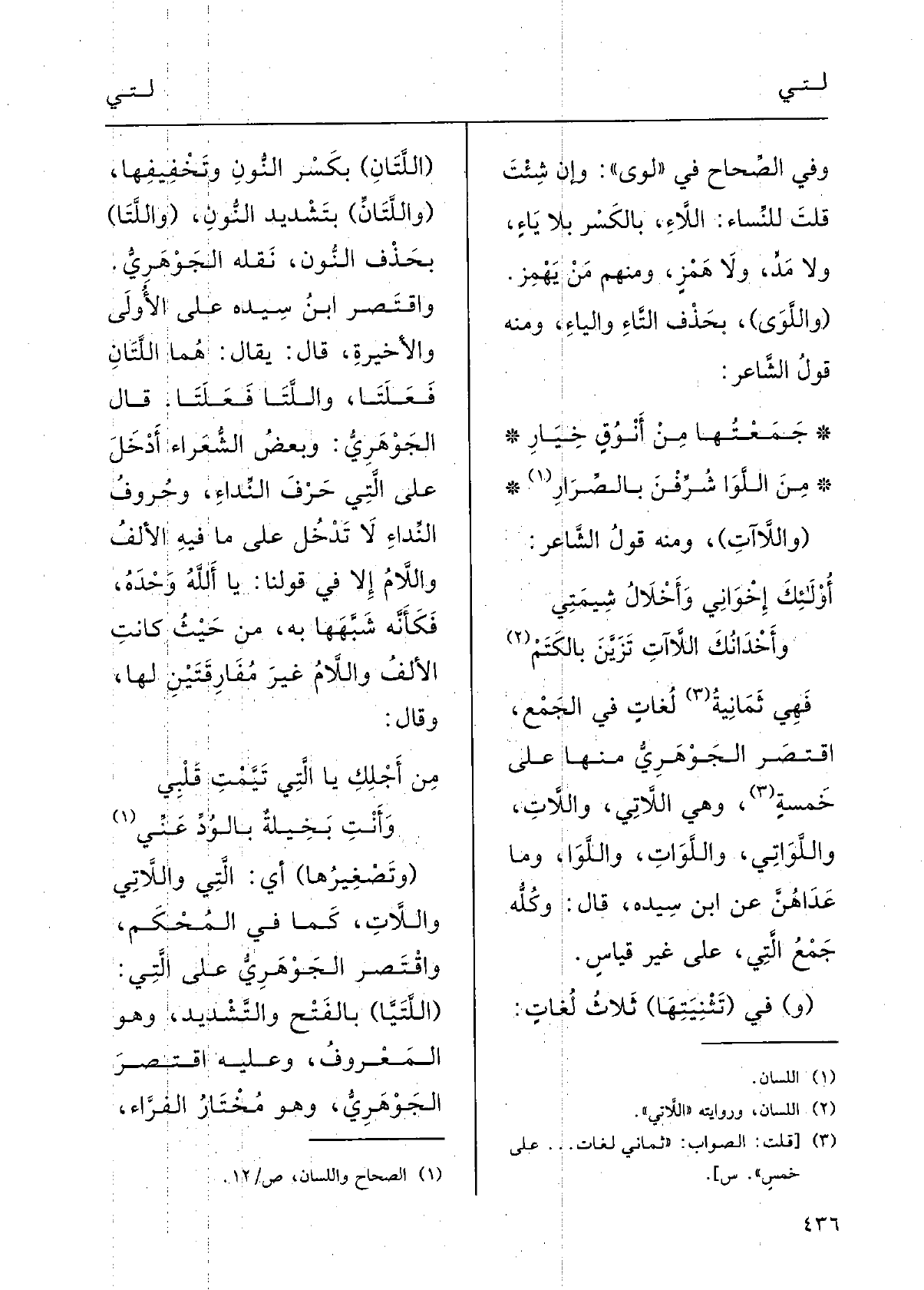واقْتَصَرَ ابنُ سِيدَه على الأولى والأخيرَةِ، قالَ: يقالُ هُما} اللَّتانِ فَعَلَتا {واللَّتَا فَعَلَتا.