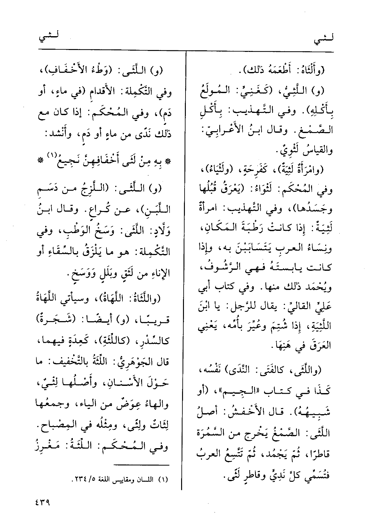 قالَ الجَوْهرِي: {اللِّثَةُ، بالتَّخْفِيفِ: مَا حَوْلَ الأسْنانِ، وأَصْلُها لِثَيٌ. والهاءُ عِوَضٌ من الياءِ، وجَمْعُها} لِثاتٌ! ولِثًى؛ ومِثْلُه فِي المِصْباح.