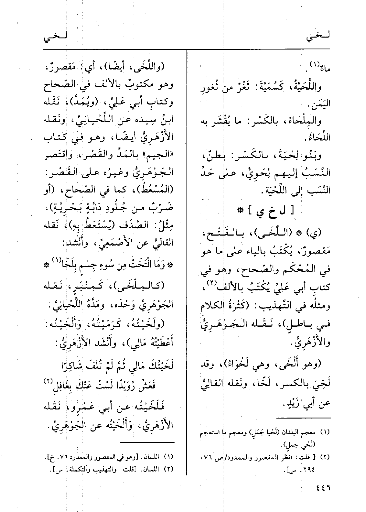 : (ي ( {اللَّخَى) ؛) بالفَتح مَقْصورٌ يُكْتَبُ بالياءِ على مَا هُوَ فِي المُحْكم والصِّحاح، وَهُوَ فِي كتابِ أبي عليَ: يُكْتَبُ بالألِفِ، ومِثْلُه فِي التّهْذيبِ؛ (كَثْرَةُ الكلامِ فِي باطِلٍ) ؛) نقلَهُ الجَوْهري والأزْهري. (وَهُوَ} أَلْخَى وَهِي {لَخْواءُ) ، وَقد} لَخِيَ، بالكسْر، لَخاً؛ ونقلَهُ القالِي عَن أَبي زيْدٍ.