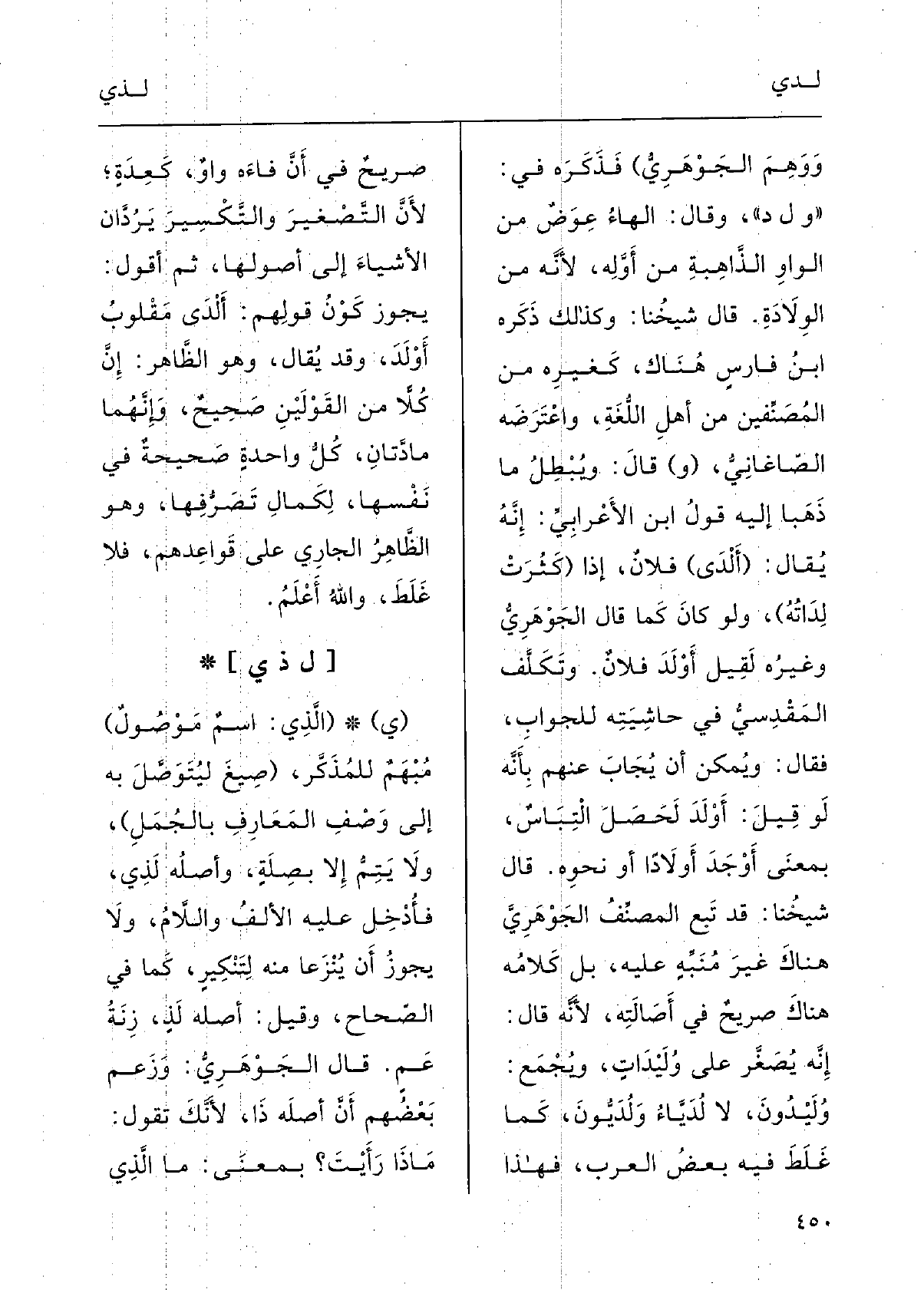 : (ي ( {الَّذي: اسْمٌ مَوْصولٌ) مُبْهمٌ للمُذَكَّر، (صِيغَ ليُتَوَصَّلَ بِهِ إِلَى وصْفِ المَعارِفِ بالجُمَلِ) ، وَلَا يتمُّ إلاَّ بصِلَةٍ، وأَصْلُه} لَذِي فأُدْخِل عَلَيْهِ الألِفُ واللامُ، وَلَا يجوزُ أَن يُنْزَعا مِنْهُ لتَنْكِير؛ كَمَا فِي الصِّحاح؛ وقيلَ: أَصْلُه لَذٍ زِنَةَ عَمٍ.