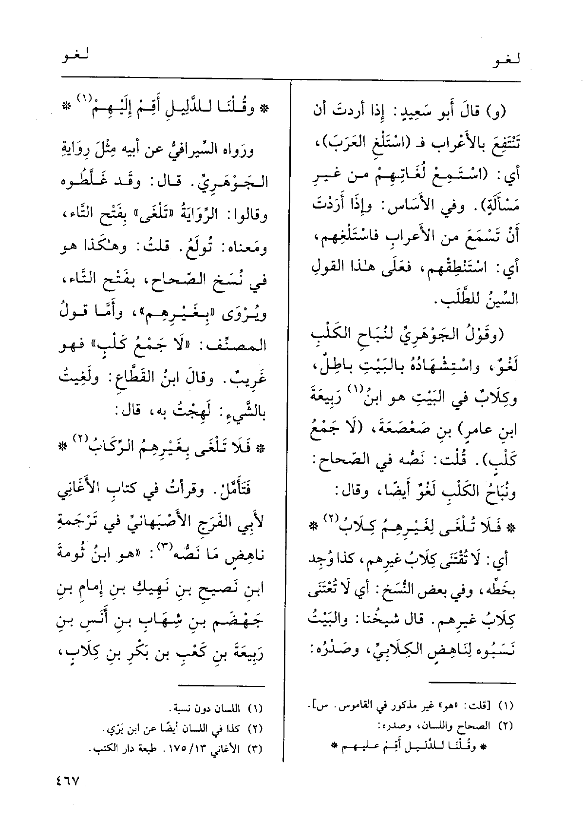 وقُلْنا للدَّلِيلِ: أَقِمْ إِلَيْهِم ورَواهُ السِّيرافي عَن أَبيهِ مِثْل روايَةِ الجَوْهرِي، قالَ: وَقد غَلَّطُوه وَقَالُوا: الرِّوايَة} تَلْغَى بفَتْح التاءِ ومَعْناه تُولَعُ.