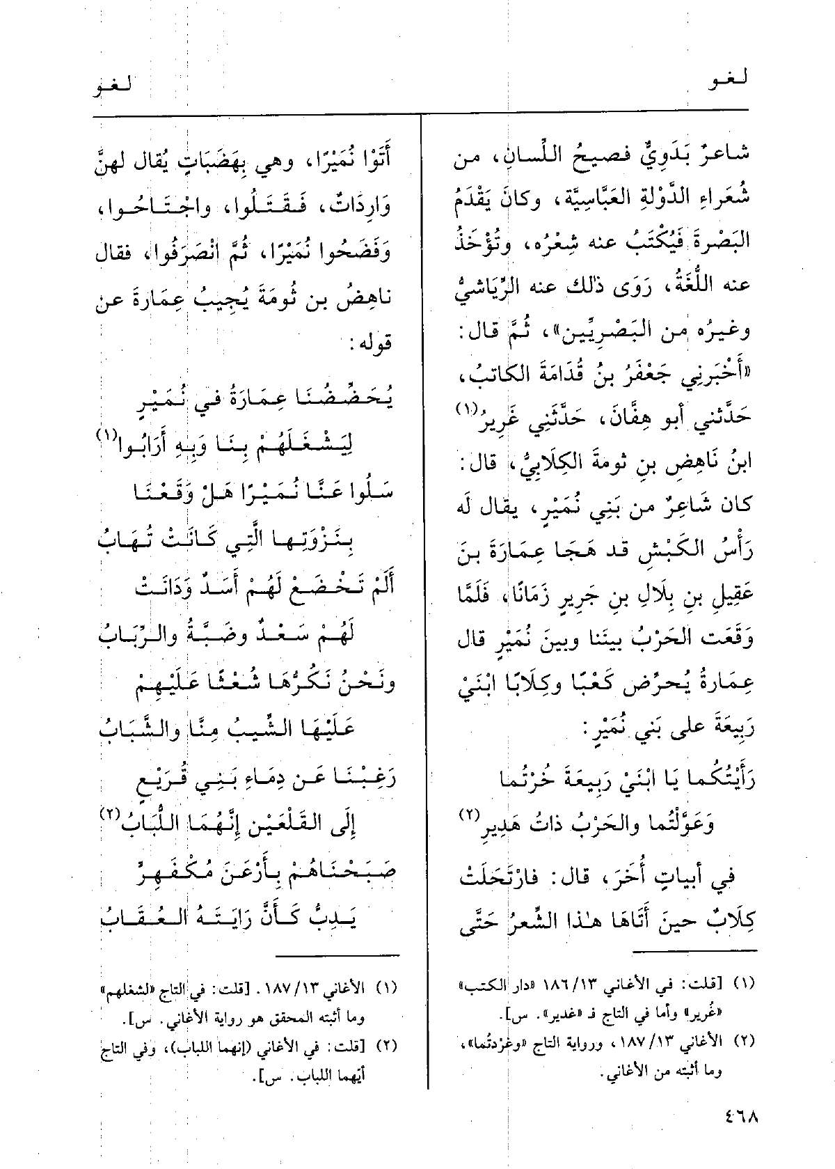 وغرّدتما والحربُ ذَات هديرفي أَبياتٍ أخر. قالَ: فارْتَحَلَتْ كِلابُ حينَ أَتاها هَذَا الشِّعْر حَتَّى أَتوا نميراً، وَهِي بهَضَباتٍ يقالُ لهنَّ واردات، فقَتَلُوا واجْتَاحُوا وفَضَحُوا نميراً ثمَّ انْصَرَفُوا، فقالَ ناهضُ بنِ ثومَةَ يُجيبُ عمارَةَ عَن قَوْله: