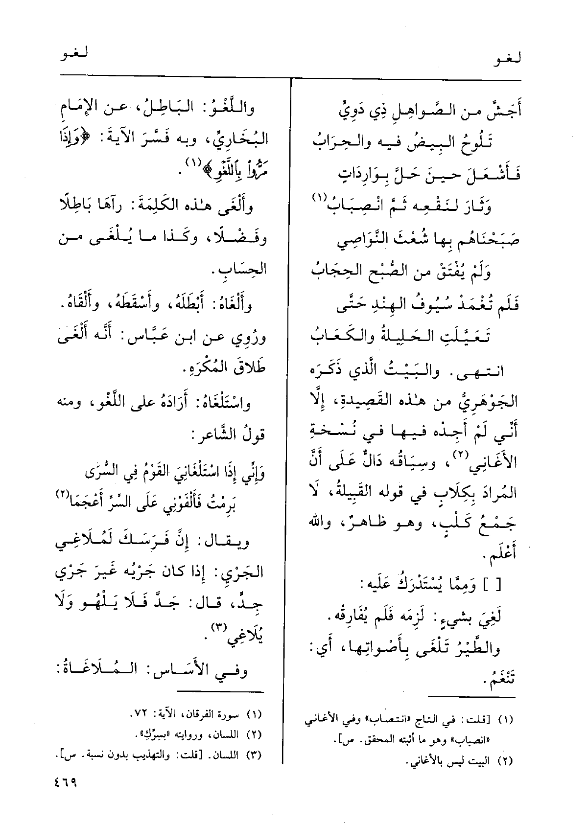 {واللَّغْوُ: الباطِلُ؛ عَن الإِمَام البُخارِي وَبِه فَسَّر الآيَةَ: {وَإِذا مَرّوا باللَّغْو} } وألْغَى هَذِه الكَلِمَة: رَآهَا بَاطِلا وفضْلاً، وَكَذَا مَا {يُلْغَى مِن الحِسابِ.