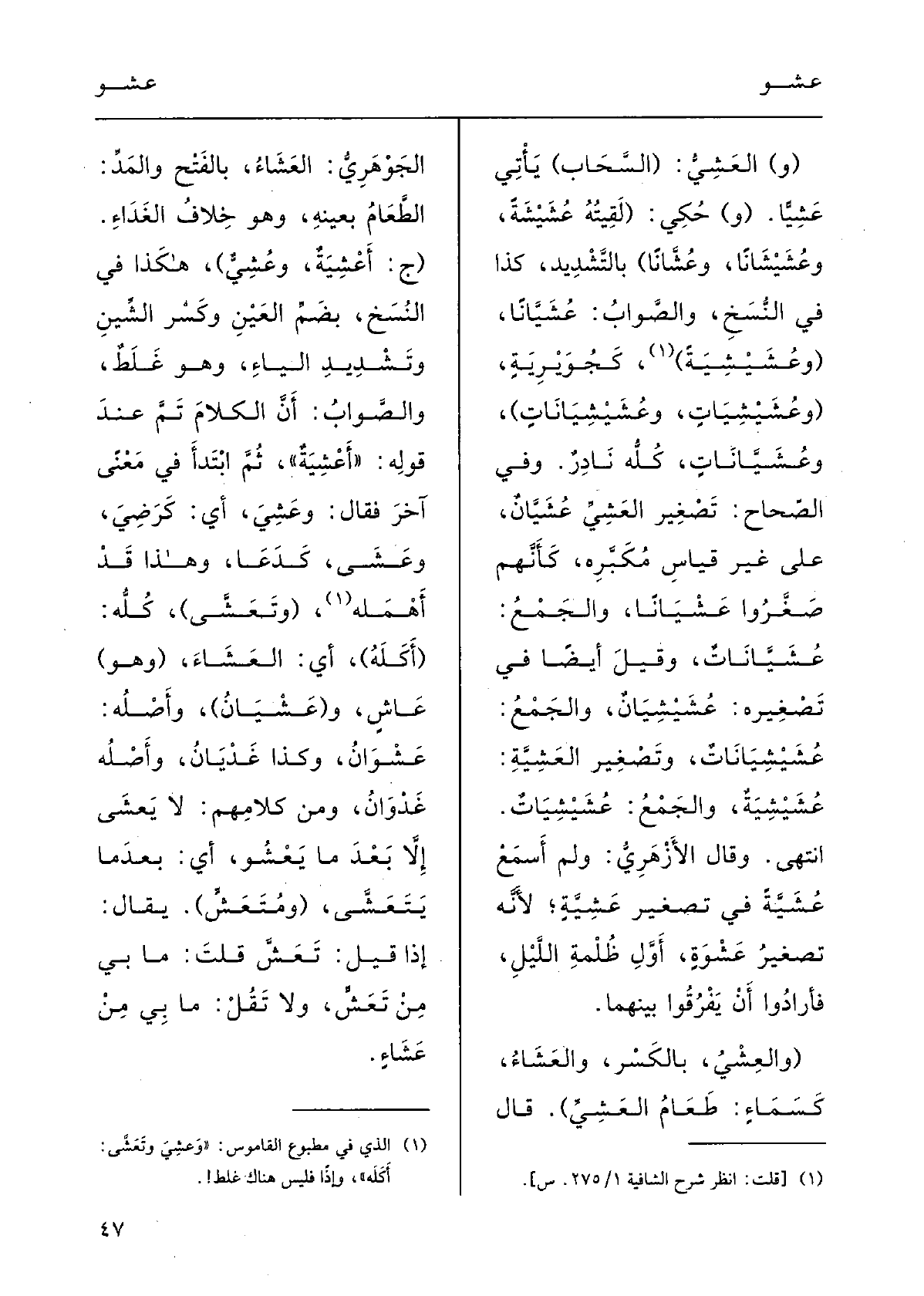(وَهُوَ) } عاشٍ و ( {عَشْيانُ) ؛) وأَصْلُه} عَشْوانٌ، وَكَذَا غَدْيانٌ وأَصْلُه غَدْوان؛ ومِن كَلامِهم: لَا {يَعْشَى إلاَّ بعدَما} يَعْشُو أَي بعدَما {يَتَعَشَّى؛ (} ومُتَعَشَ) .) يقالُ إِذا قيلَ، {تَعَشَّ، قُلْت: مَا بِي من} تَعَشِّ، وَلَا تَقُلْ: مَا بِي من عَشاءٍ.