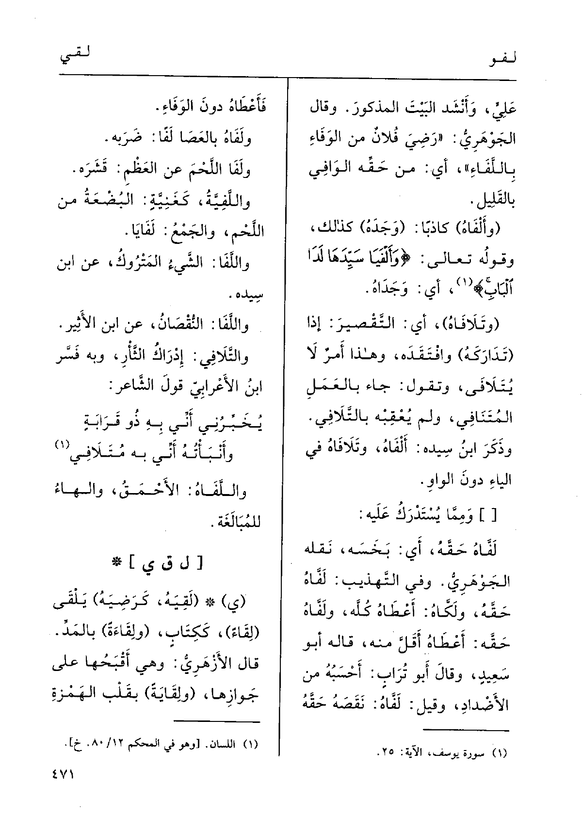 ( {وأَلْفاهُ) كاذِباً: (وَجَدَهُ) كَذلكَ؛ وَقَوله تَعَالَى: {} وأَلْفَيَا سَيِّدَها لَدَى البابِ} ، أَي وَجَدَاهُ.