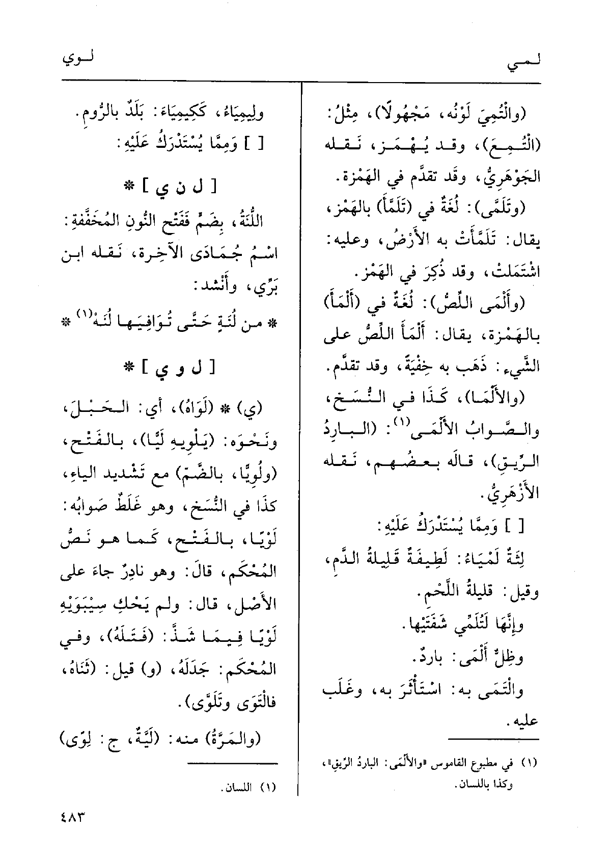 ( {والْتُمِيَ لَوْنُه، مَجْهولاً) :) مثْلُ (الْتُمِعَ) ، وَقد يُهْمَز؛ نقلَهُ الجَوْهرِي؛ وَقد تقدَّم فِي الهَمْزةِ.
