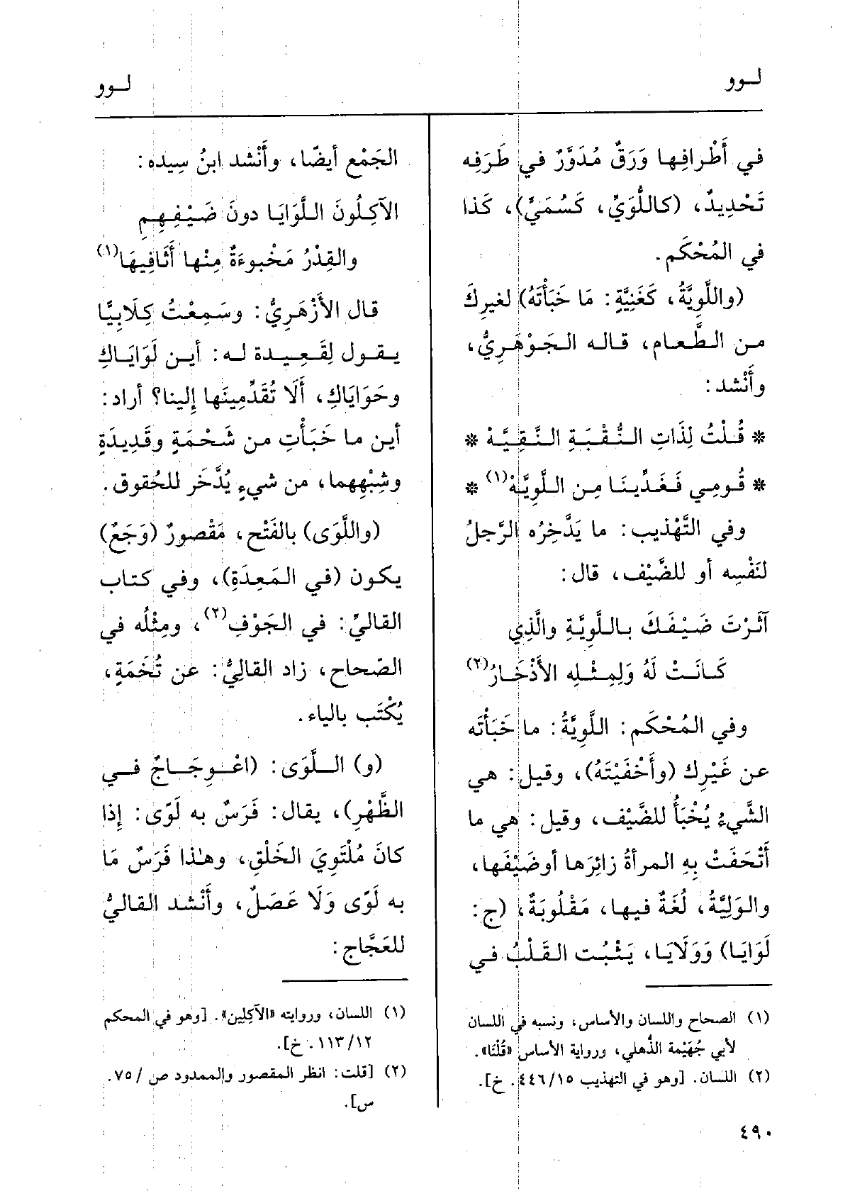 كانتْ لَهُ ولِمِثْلِه الأَذْخارُوفي المُحْكم: اللَّويَّةُ: مَا خَبَأْتَهُ عَن غيرِكَ (وأَخْفَيْتَه) ؛) وقيلَ: هِيَ الشيءُ يُخْبَأُ للضَّيْفِ؛ وقيلَ: هِيَ مَا أَتْحَفَتْ بِهِ المرأَةُ زائِرَها أَوْ ضَيْفَها؛ والوَلِيَّةُ: لُغَةٌ فِيهَا مَقْلوبَةٌ؛ (ج لَوايَا) ووَلايَا يثْبتُ القَلْبُ فِي الجَمْعِ أَيْضاً؛ وأَنْشَدَ ابنُ سِيدَه: