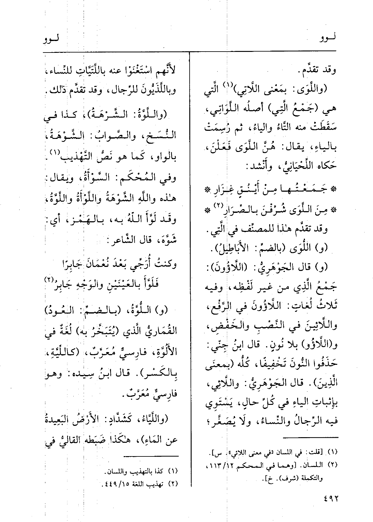 فَلَوَّأَ بالعَيْنَين والوَجْه جابرُ (و) اللُّوَّةِ، (بالضَّمِّ: العُودُ) القماري الَّذِي (يُتَبَخَّرُ بِهِ) ، لُغَةٌ فِي الأَلُوَّةُ، فارِسيٌّ مُعَرَّبٌ، (كاللِّيَّةِ، بِالْكَسْرِ) ، قالَ ابنُ سِيدَه: وَهُوَ فارِسِيٌّ مُعَرَّبٌ.