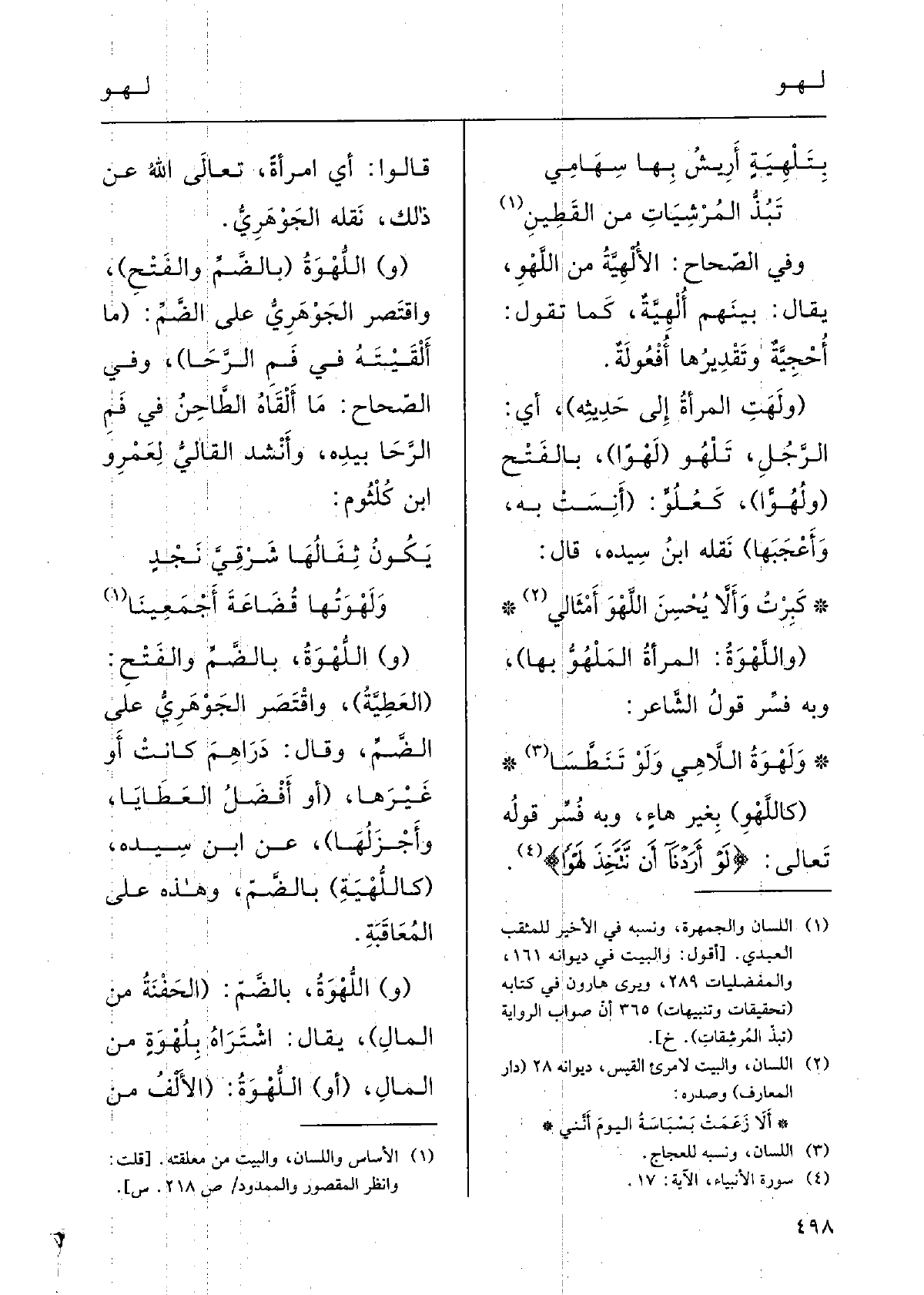 } ولَهْوةُ {اللاَّهِي وَلَو تَنَطَّسا (} كاللَّهْوِ) ، بغَيرِها؛ وَبِه فُسِّر قولُه تَعَالَى: {لَو أَرَدْنا أَن نَتَّخِذْ لَهْواً} . قَالُوا: أَيِ امْرأَةً تَعَالَى اللهُ عَن ذلكَ؛ نقلَهُ الجَوْهرِي.