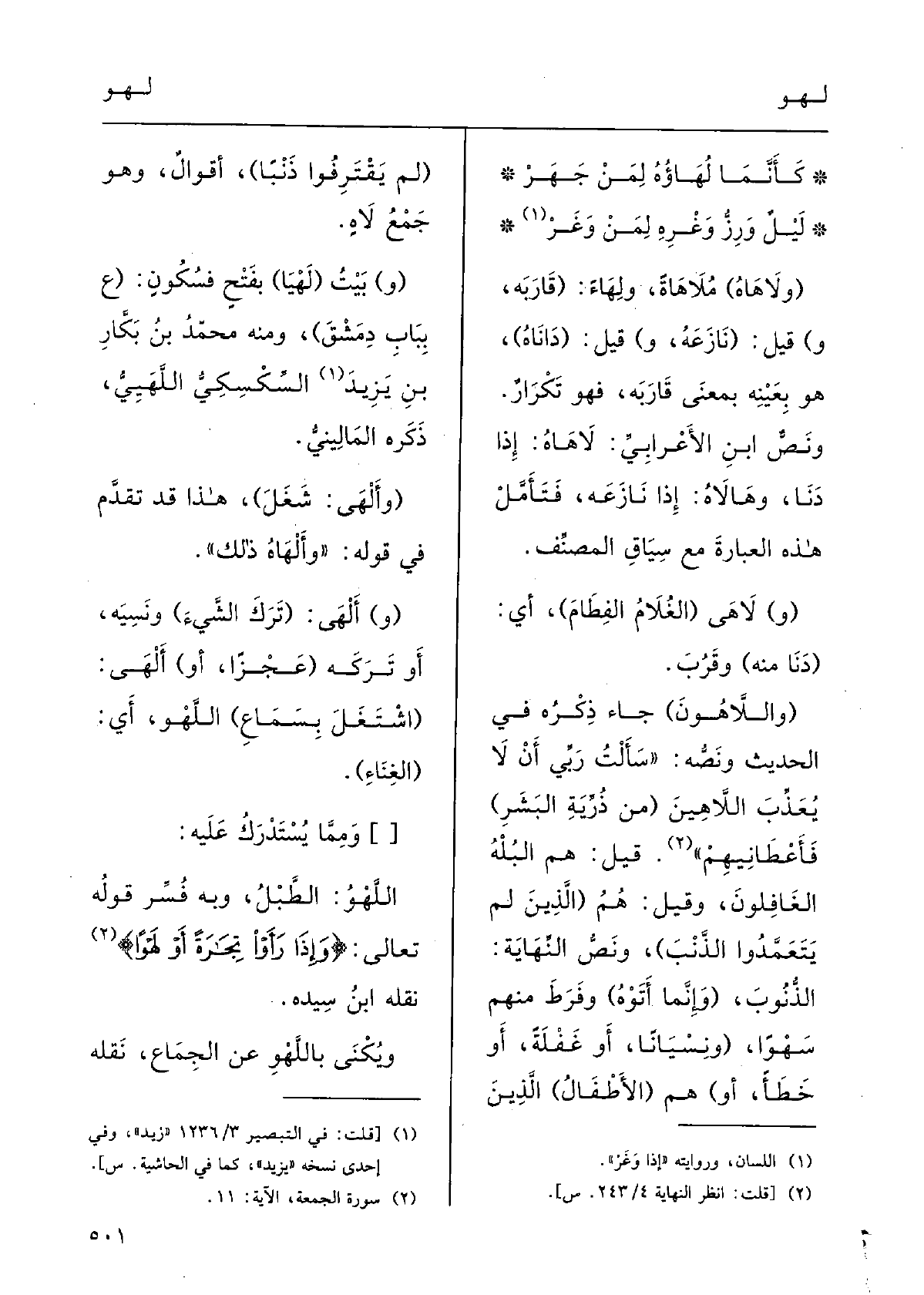 ( {واللاَّهونَ) :) جاءَ ذِكْرُه فِي الحديثِ ونَصّه: (سأَلْتُ ربِّي أَن لَا يعذِّبَ} اللاَّهينَ (من ذُرِّيَّةِ البَشَرِ) فأَعْطانِيهم) ،) قيلَ: هم البُلْه الغافِلُون، وقيلَ: هم (الذينَ لم يَتَعَمَّدُوا الذَّنْبَ) ، ونَصّ النِّهايةِ: الذّنُوبَ؛ (وإنّما أَتَوْهُ) وفرطَ مِنْهُم سَهْواً و (نِسْياناً أَو غَفْلَةً أَو خَطَأً، أَو) هُم (الأطْفالُ) الذينَ (لم يَقْتَرِفُوا ذَنْباً) ؛) أَقْوالٌ، وَهُوَ جمْعُ {لاهٍ.