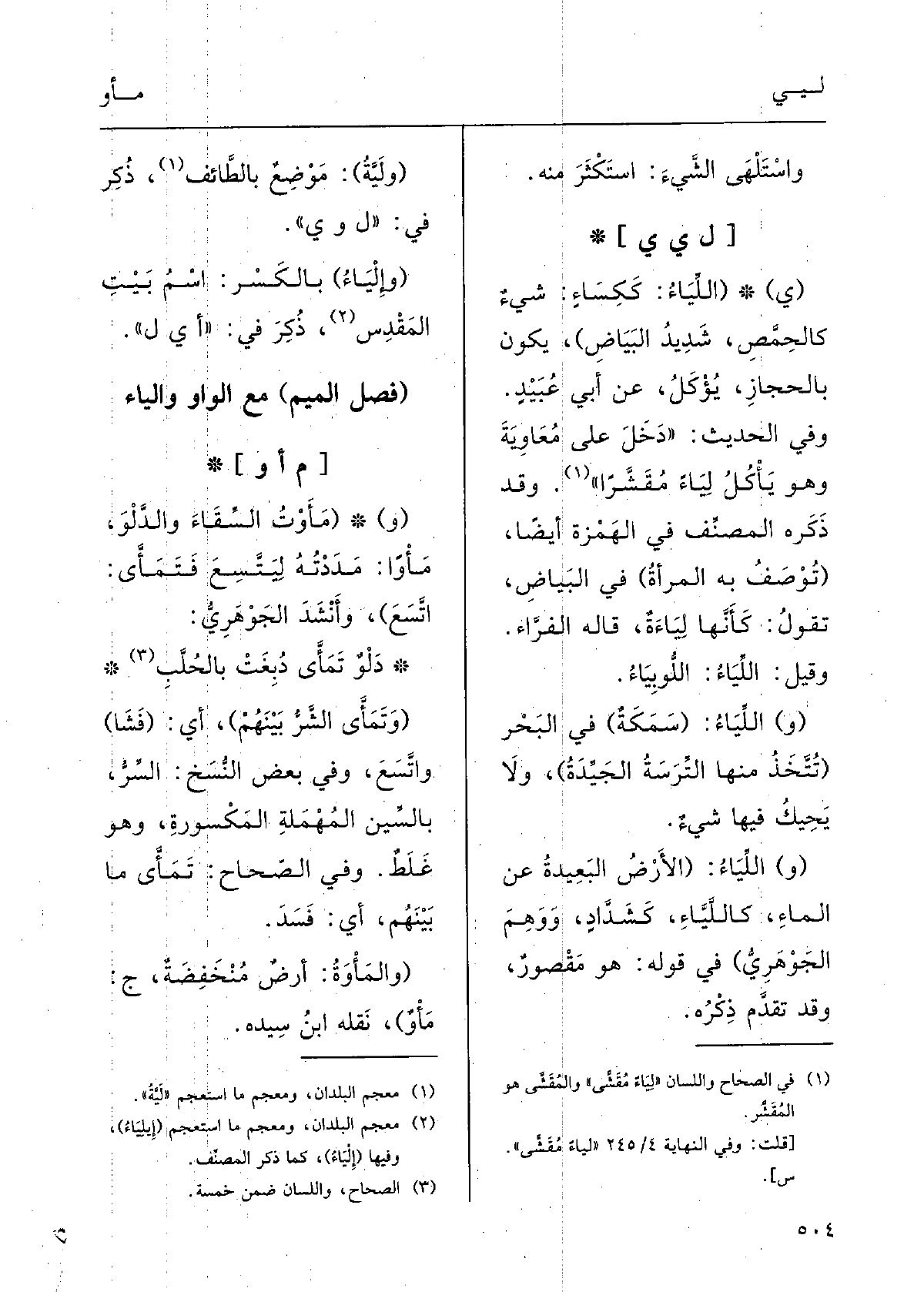 : (ي ( {اللِّياءُ، ككِساءٍ: شيءٌ كالحِمَّصِ شَديدُ البَياضِ) يكونُ بالحِجازِ يُؤْكَلُ، عَن أَبي عبيدٍ. وَفِي الحديثِ: (دَخَلَ على مُعاوِيَةَ وَهُوَ يأْكُلُ} لِياءً مُقشِّراً) . وَقد ذَكَرَه المصنِّفُ فِي الهَمْزةِ أَيْضاً. (تُوصَفُ بِهِ المَرْأَةُ) فِي البَياضِ، تقولُ: كأَنَّها {لِياءَةٌ؛ قالَهُ الفرَّاء.