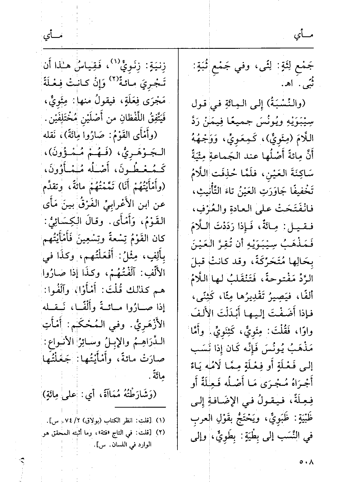وأمَّا مَذْهب يُونُس فإنَّه كانَ إِذا نَسَبَ فَعْلة أَو فِعْلة ممَّا لامَه يَاء أَجْراهُ مُجْرى مَا أَصْلَه فَعِلة أَو فِعِلة، فَيَقُول فِي الإضافَةِ إِلَى ظَبْيَة ظَبَوِيٌّ، ويحتجُّ بقولِ العربِ فِي النّسَبِ إِلَى بطْيَة بِطَويّ وَإِلَى زِنْيَة زِنَوِيّ، فقِياسُ هَذَا أنْ يجْرِي فِئَة وَإِن كانتْ فِعْلة مَجْرى فِعَلة فَيَقُول مِنْهَا مِئَوِيٌّ فيَتَّفِقُ اللَّفْظان من أَصْلَيْن مُخْتَلِفَيْن.