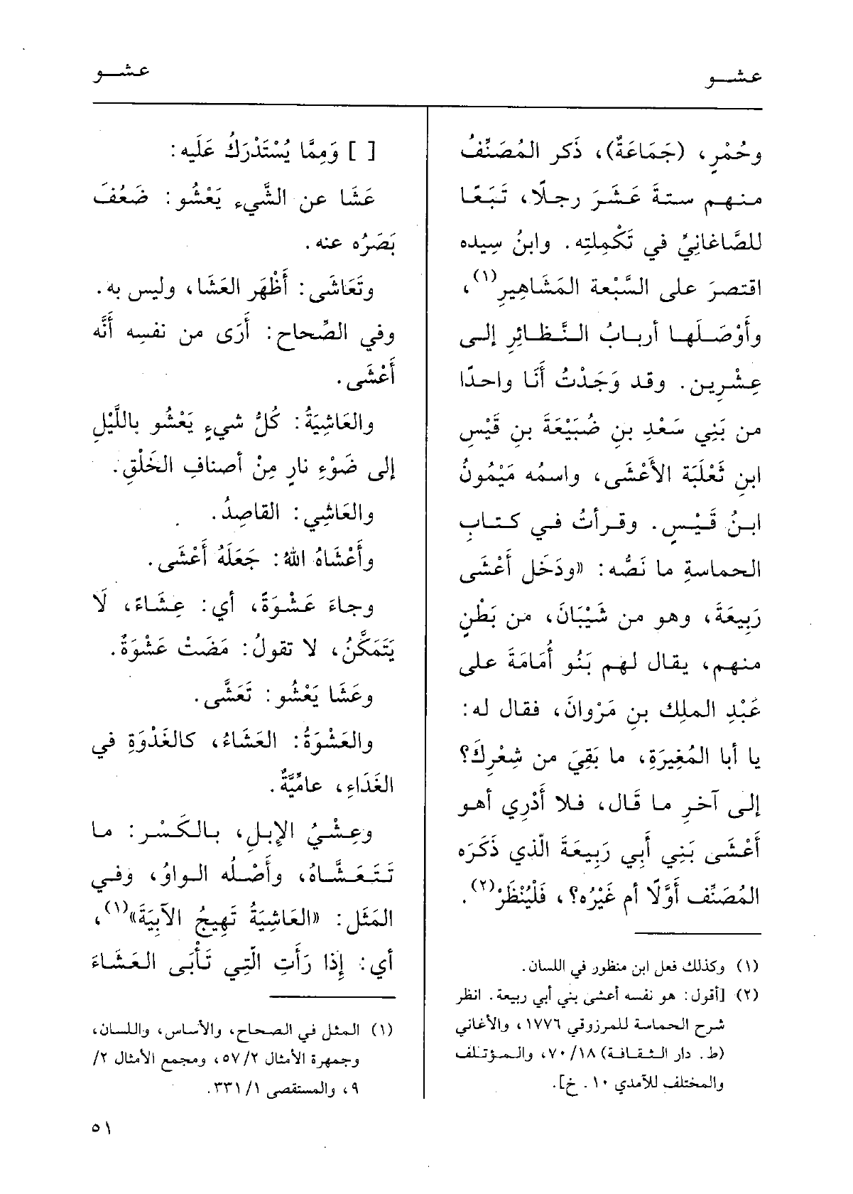 وقرَأْتُ فِي كتابِ الحماسَةِ مَا نَصُّه: ودَخَلَ أَعْشَى ربيعَةَ، وَهُوَ مِن شَيْبان مِن بَطْنٍ مِنْهُم، يقالُ لَهُم بَنُو أَمامَةَ، على عبدِ الملِكِ بنِ مَرْوان فقالَ لَهُ: يَا أَبا المُغِيرَةَ مَا بَقِيَ مِن شِعْرِك إِلَى آخِرِ مَا قالَ فَلَا أَدْرِي هُوَ أَعْشَى بَنِي أَبي ربيعَةَ الَّذِي ذَكَرَه المصنِّفُ أَوَّلاَ أَمْ غَيْره، فليُنْظر.