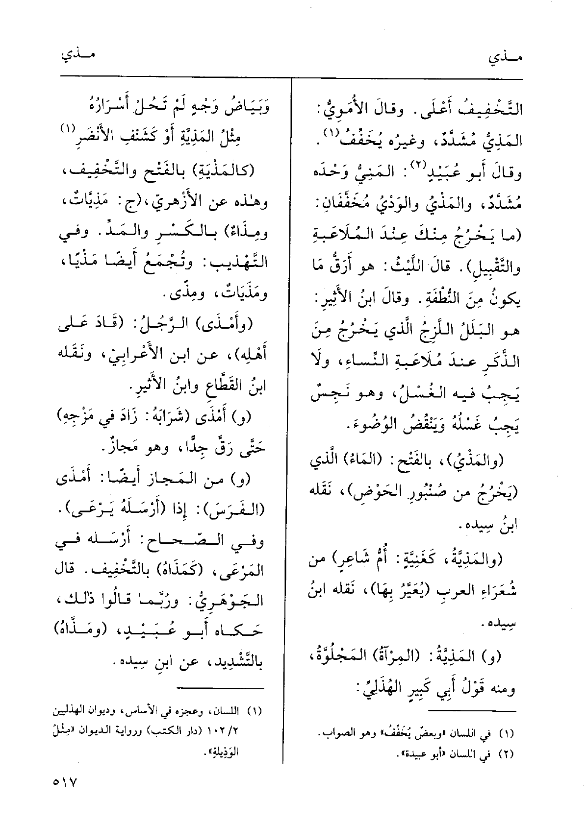 التَّخْفِيفُ أَعْلَى؛ وقالَ الأُمَويُّ: المَذِيُّ مُشَدَّد، وغيرُه يُخَفِّفُ. وقالَ أَبُو عبيدٍ: المَنِيُّ وحْدُه مُشَدَّد، {والمَذْيُ والوَدْيُ مُخَفَّفان؛ (مَا يَخْرُجُ منْكَ عنْدَ المُلاعَبةِ والتَّقْبِيلِ) .