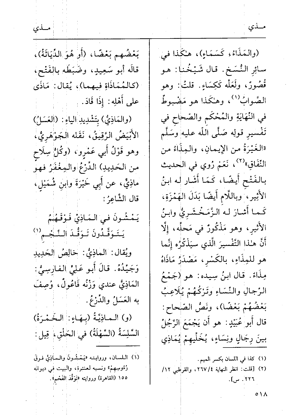 قالَ أَبو عليَ الفارِسِيُّ: الماذِي عنْدِي وَزْنه فَاعول، وُصِفَ بِهِ العَسَلُ والدِّرْع.