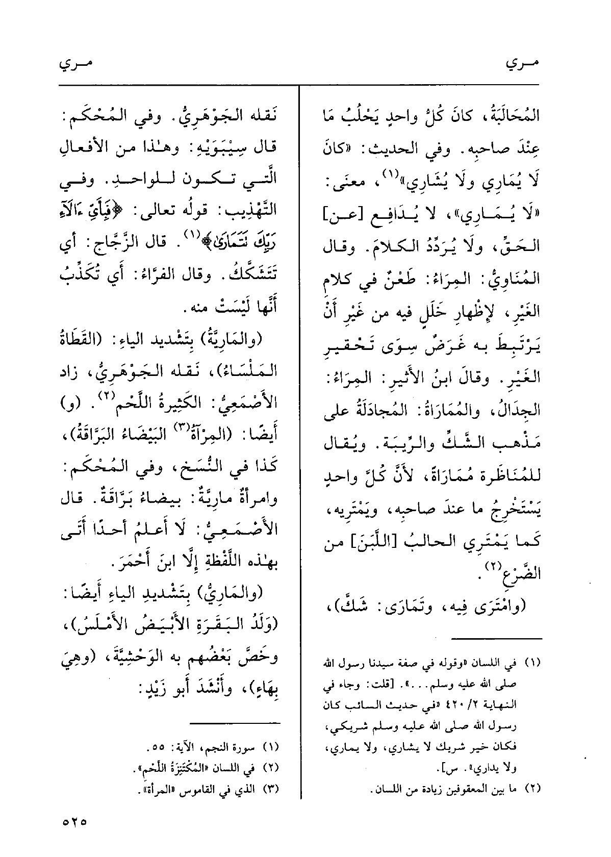 وقالَ ابنُ الْأَثِير: المِراءُ الجِدَالُ، {والمُمَارَاةُ المُجادَلَةُ عَلى مَذْهبِ الشَّكِّ والرِّيبةِ، ويقالُ للمُناظَرَةِ مُمارَاة لأنَّ كلَّ واحِدٍ يَسْتَخْرجُ مَا عنْدَ صاحِبِه} ويَمْتَرِيه كَمَا {يَمْتَرِي الحالِبُ مِن الضَّرْعِ.