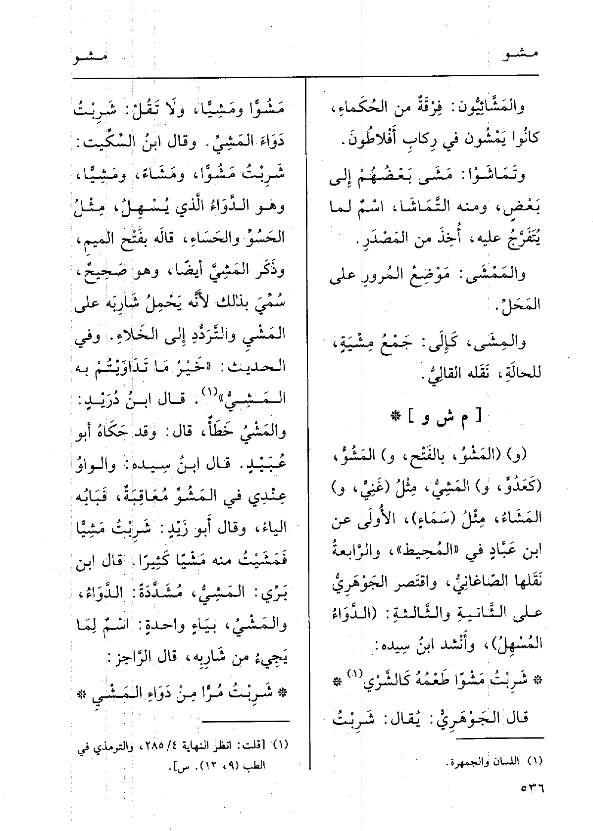 قالَ ابْن برِّي: المَشِيُّ، مشدَّدَة: الدَّواءُ، والمَشْيُ، بياءٍ واحِدَةٍ اسْمٌ لمَا يَجِيءُ من شارِبِه؛ قَالَ الراجزُ: