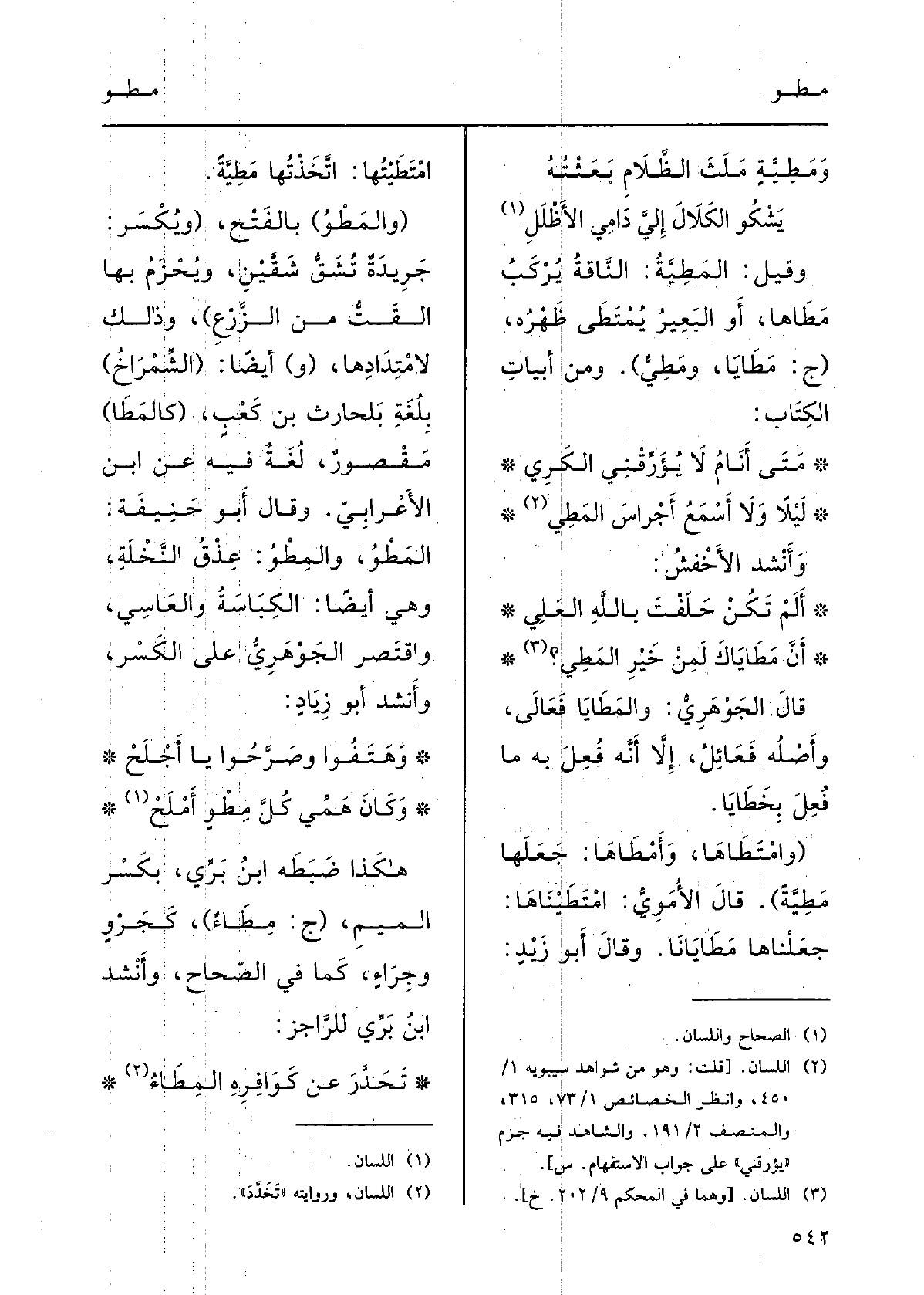 يَشْكُو الكَلالَ إليَّ دامِي الأظْلَلِوقيلَ: المَطِيَّةُ: الناقَةُ يُرْكَبُ} مَطاها؛ أَو البَعيرُ يُمْتَطَى ظَهْرُه؛ (ج: {مَطايا} ومَطِيٌّ) ، ومِن أَبياتِ الكتابِ: