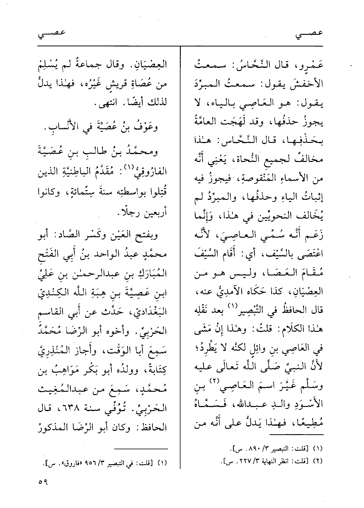 قالَ النحَّاسُ: سَمعْتُ الأخْفَش يقولُ: سَمِعْتُ المبِّردَ يقولُ هُوَ {العاصِيُ بالياءِ، لَا يجوزُ حَذْفَها وَقد لهَجَتِ العامَّةُ بحْذِفها؛ قالَ النحَّاسُ: هَذَا مُخالِفٌ لجِميعِ النُّحاة، يُعْني أَنَّه مِنَ الأسْماَءِ الَمنْقوصَةِ فيجوزُ فِيهِ إثْبات الياءِ وحَذْفها، والمبِّردُ لم يَخالِفِ الَنّحويِّين فِي هَذَا، وإنَّما زَعَمَ أَنّه سُمِّيَ العاصى لأنّه اعَتَصَى بالسَّيْفِ أَيأَقامَ السَّيْفَ مقامَ العَصا وليسَ هُوَ مِن العِصْيان، كَذَا حَكَاه الآمدِي عَنهُ.