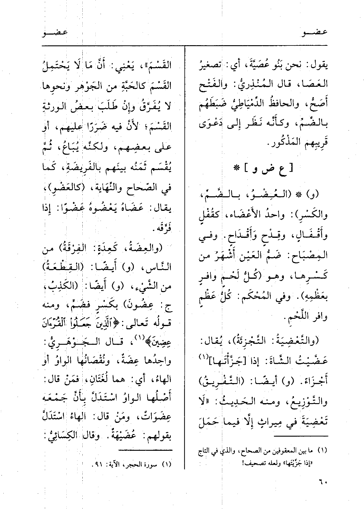 (و) أَيْضاً: (الكَذِبُ؛ ج} عِضُونَ) ، بكسْرٍ فضمٌّ؛ وَمِنْه قولُه تَعَالَى: {الَّذين جَعَلُوا القُرْآنَ {عِضِينَ} .