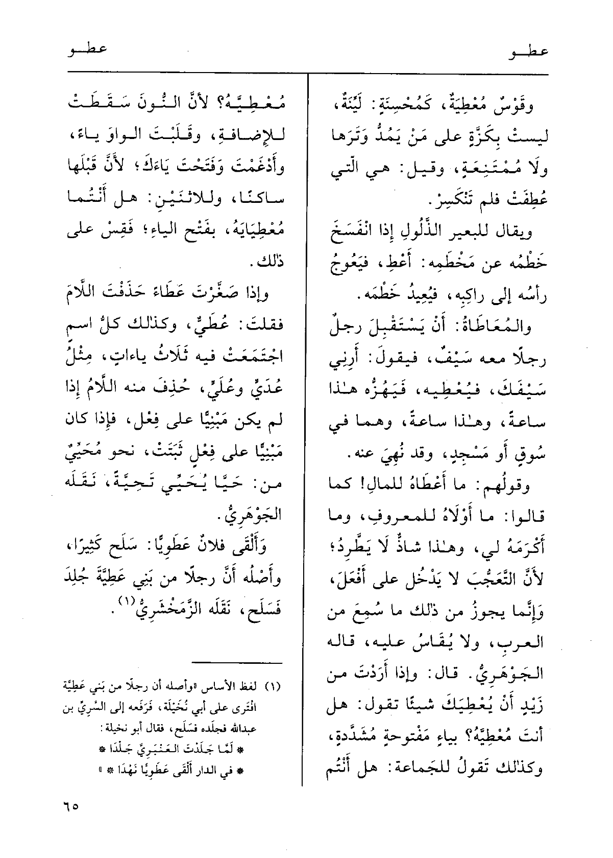 قالَ: وَإِذا أَرَدْتَ مِن زيْدٍ أَن} يُعْطِيك شَيْئا تقولُ: هَل أَنْتَ {مُعْطِيَّه؟ بياءٍ مَفْتوحةٍ مشدَّدَةٍ، وكذلكَ تقولُ للجماعَةِ: هَل أَنْتم معطِيَّهُ؟ لأنَّ النّونَ سَقَطَتْ للإضافَةِ، وقَلَبْتَ الواوَ يَاء وأدْغَمْتَ وفَتَحْتَ ياءَك لأنَّ قبْلَها ساكِناً، وللاثْنَيْن: هَل أَنْتُما} معطِيايَهُ، بفَتْح الياءِ، فقِس على ذلكَ. وَإِذا صَغَّرْتَ {عَطاءً حذفْتَ اللامَ فقلْتَ} عُطَيٌّ، وكَذلكَ كلّ اسْمٍ اجْتَمَعَتْ فِيهِ ثلاثُ ياآتِ، مِثْلُ عُدَيّ وعُلَيّ حُذِفَتْ مِنْهُ اللامُ إِذا لم يكنْ مَبْنيّاً على فِعْل، فَإِذا كانَ مَبْنِيّاً على فِعْلٍ ثبتَتْ نَحْو مُحَيّي مِن حيَّا يُحَيِّي تَحِيَّة؛ نقلَهُ الجوهريُّ.