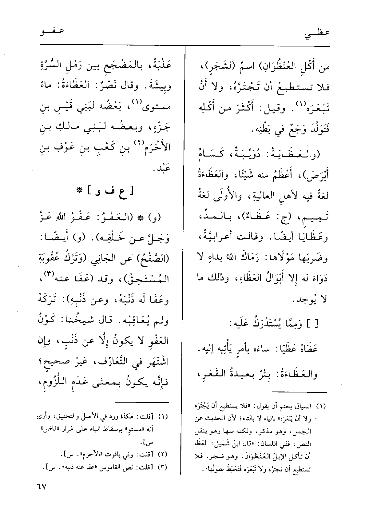 قَالَ شيْخُنا: كَوْن العَفْو لَا يكونُ إلاَّ عَن ذَنْبٍ وَإِن اشْتَهَرَ فِي التَّعارُفِ غيْر صَحِيحٍ، فإنَّه يكونُ بمعْنَى عَدَمِ اللُّزُوم،