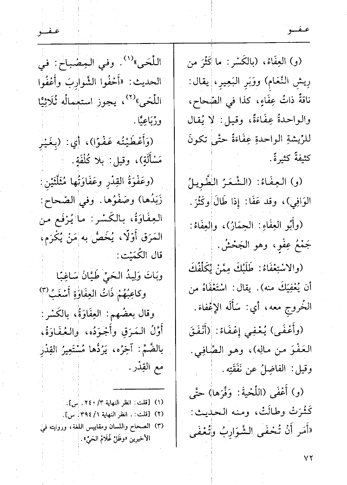 وَفِي المِصْباح: فِي الحديثِ: (احْفُوا الشَّوارِبَ واعْفُوا اللِّحَى) ، يجوزُ اسْتِعْمالُه ثلاثِيًّا ورباعِيّاً.