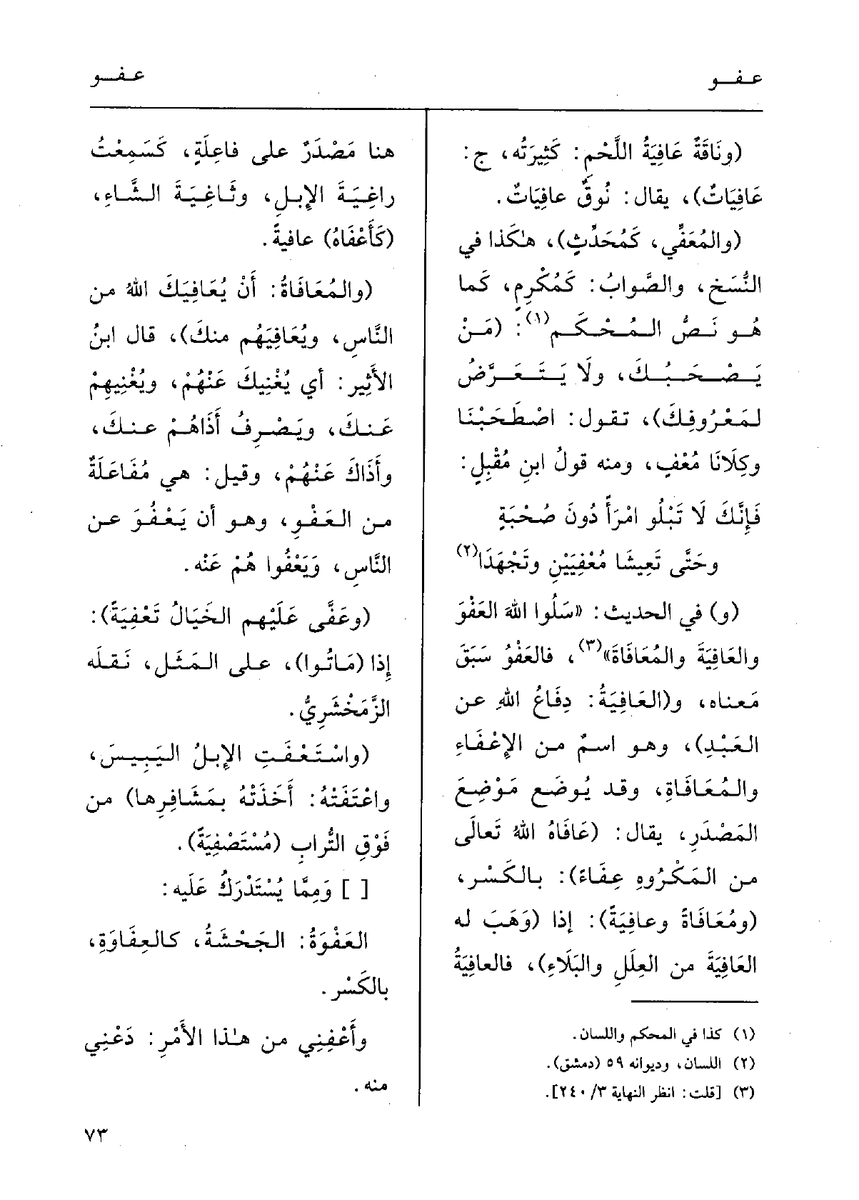 وَحَتَّى تَعْيشا {مُعْفِيَيْنِ وتَجْهَدا (و) فِي الحديثِ: (سَلُوا اللهَ العَفْوَ والعافِيَة والمُعافاة) ، فالعَفْوُ سَبَقَ مَعْناه؛ و (} العافِيَةُ: دِفاعُ اللهِ عَن العبدِ) ، وَهُوَ اسْمٌ مِن الإعفاءِ. والمُعافَاة، وَقد يُوضَعُ مَوْضِع المَصْدَرِ يقالُ: (عَفاهُ اللهُ تَعَالَى مِن المَكْرُوه عِفاءً) ، بالكسْرِ، ( {ومُعافاةً} وعافِيَةً) إِذا (وَهَبَ لَهُ العافِيَةَ مِن العِلَلِ والبَلاءِ) ، {فالعافِيَةُ هُنَا مَصْدرٌ على فاعِلَةِ، كسَمِعْت راغِيَةَ الإبِلِ وثاغِيَةَ الشاءِ، (} كأَعْفاهُ) {عافِيَةً؛ (والمُعافاةُ: أَن} يُعافِيَكَ اللهُ من النَّاسِ {ويُعافِيَهُم منكَ) .