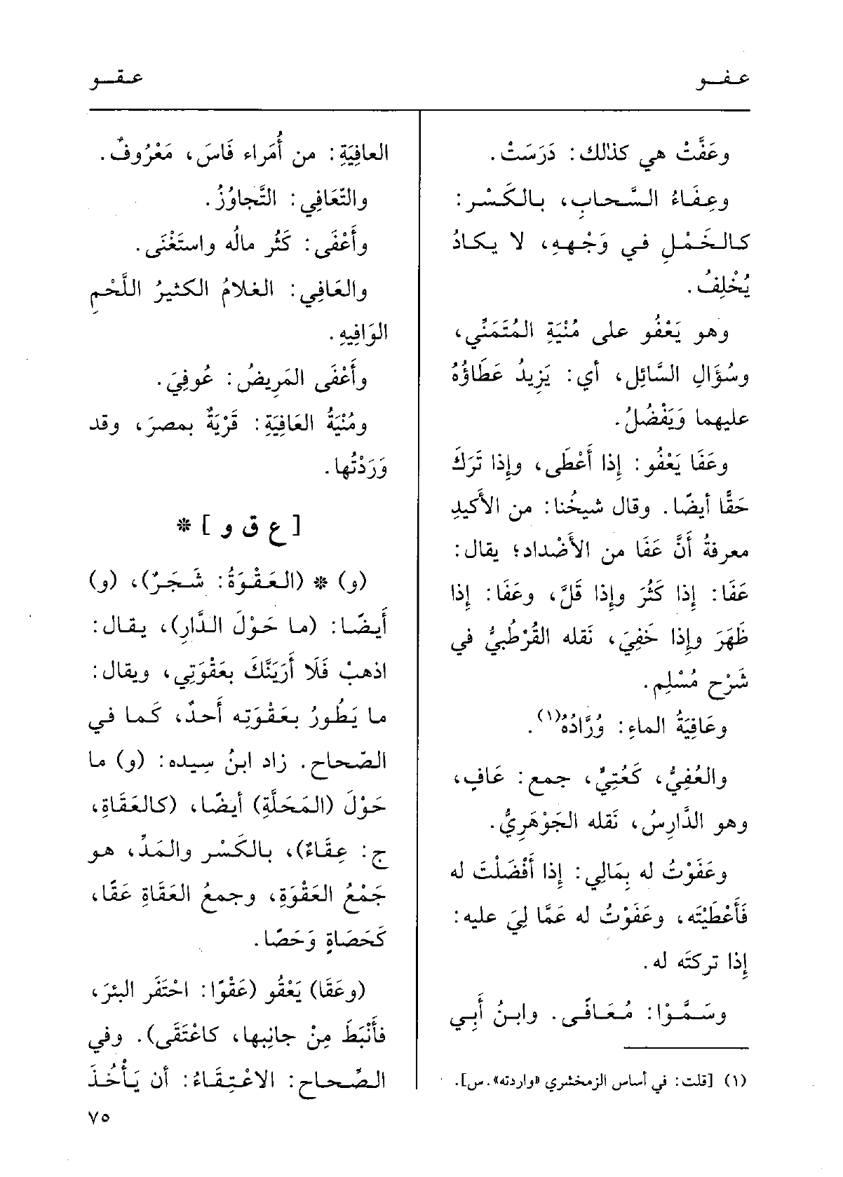 وَقَالَ شيْخُنا: من الأكِيدِ مَعْرفَة أَنَّ عَفا مِنَ الأَضْدادِ، يقالُ: عَفا إِذا كَثُر، وَإِذا قَلَّ، وعَفا إِذا ظَهَر وَإِذا خَفِيَ؛ نقلَهُ القُرْطبي فِي شرْحِ مُسْلم.