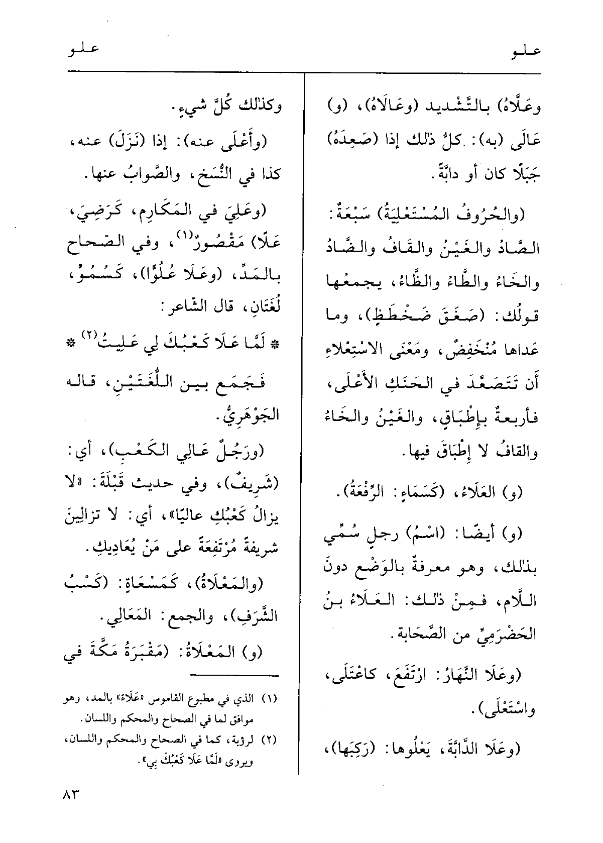 (وعَلِيَ فِي المَكارِمِ، كرضِيَ، عَلاً) ، مَقْصورٌ، وَفِي الصِّحاحِ بالمدِّ، (وعَلاَ عُلُوًّا) ، كسُمُوَ: لُغَتانِ، قَالَ الشَّاعِرُ: