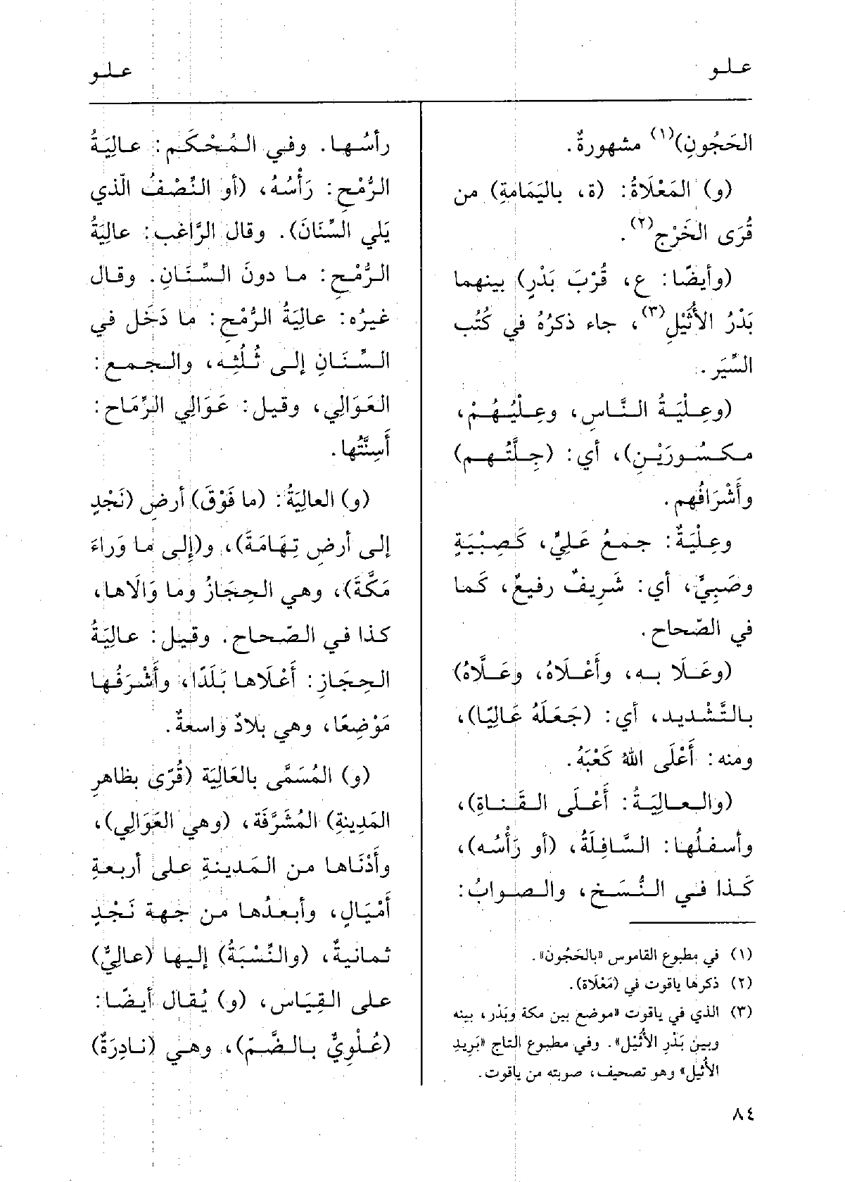 (و) المُسَمَّى {بالعالِيَةِ (قُرًى بظاهِرِ المدينةِ) المُشرَّفَةِ، (وَهِي العَوالِي) ، وأَدْنَاها من المدينَةِ على أَرْبَعَةِ أَمْيالٍ وأَبْعَدها من جهَةِ نَجْدٍ ثَمانِيَة، (والنِّسْبَةُ) إِلَيْهَا (} عالِيٌّ) على القِياسِ؛ (و) يقالُ أَيْضاً: (! عُلْوِيٌّ، بالضَّمِّ) وَهِي (نادِرَةٌ)