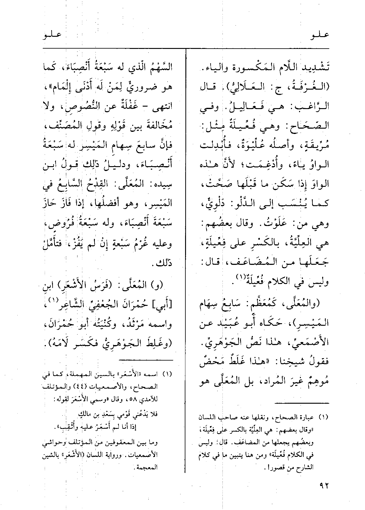 ( {والمُعَلَّى، كمُعَظَّمٍ: سابِعُ سِهامِ المَيْسِرِ) ؛) حَكاهُ أَبو عبيدٍ عَن الأصْمعي؛ هَذَا نَصّ الجَوْهري فقولُ شيْخنا هَذَا غَلَطٌ مَحْضٌ مُوْهِم غَيْر المُرَاد، بلِ} المُعَلّى هُوَ السَّهْم الَّذِي لَهُ سَبْعَة أَنْصباء كَمَا هُوَ ضَرورِي لمَنْ لَهُ أَدْنى إِلْمَام، انتَهَى. غَفلَة عَن النُّصُوص وَلَا مُخالَفَة بينَ قوْلِه وقَوْل المصنّف، فإنَّ سابِعَ سِهامِ المَيْسِر لَهُ سَبْعَة أَنْصِباء، ودليلُ ذلكَ قَوْلُ ابنِ سِيدَه: المُعَلَّى: القِدْحُ السابِعُ فِي المَيْسِرِ وَهُوَ أَفْضَلُها إِذا فازَ حازَ سَبْعَةَ أَنْصِباء وَله سَبْعَة فُروضٍ، وَعَلِيهِ غُرْمُ سَبْعة إِن لم يَفُزْ، فتأَمَّل ذلكَ.