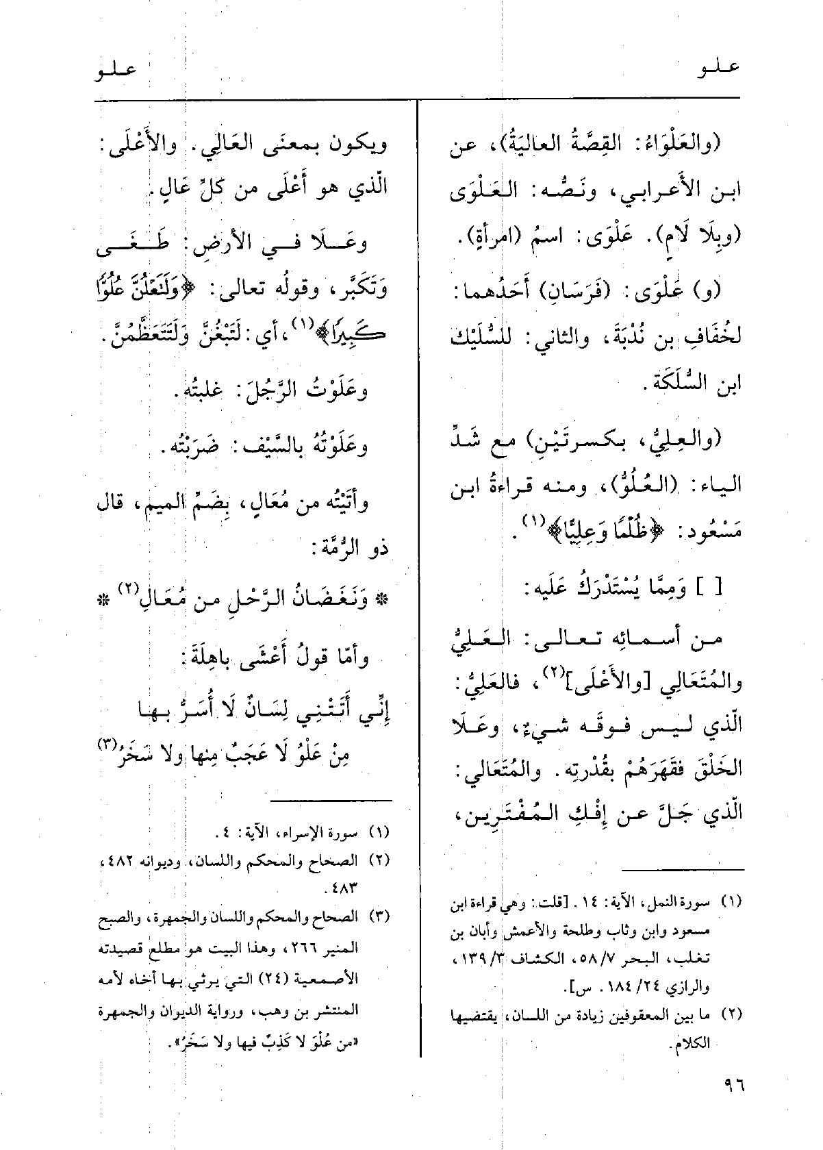 (} والعِلِيُّ، بكَسْرَتَيْنِ) مَعَ شَدِّ الياءِ: ( {العُلُوُّ) ، وَمِنْه قِراءَةُ ابنِ مَسْعود {ظلما} وعِلِيًّا} .