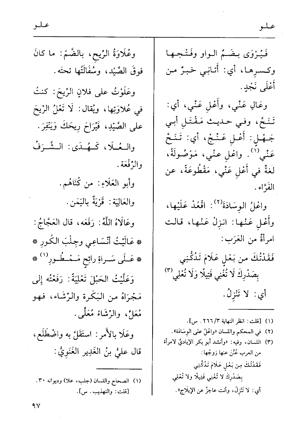 } واعْلُ الوِسادَةَ: اقْعُد عَلَيْهَا، وأعْلِ عَنْهَا: انْزِلْ عَنْهَا؛ قالتِ امْرأَةٌ من العَرَبِ: