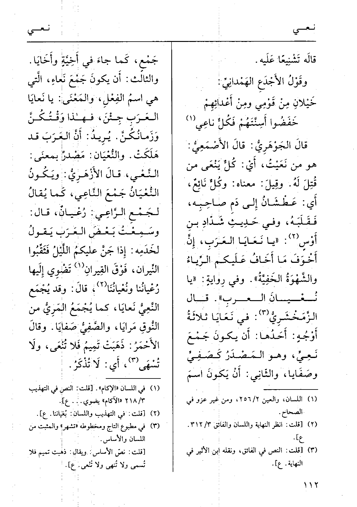 قالَ الأزْهري: ويكونُ {النّعْيان جَمْع} الناعِي، كَمَا يقالُ لجمْعِ الرَّاعِي رُعْيان، قالَ وسَمِعْتُ بعضَ العَرَبِ يقولُ لخَدَمِه: إِذا جَنَّ عَلَيْكُم اللّيْلُ فثَقِّبوا النِّيرانَ فوْقَ القيروان تَضْوي إِلَيْهَا رُعْيانُنا {ونُعْيانُنا؛ قالَ: وَقد يُجْمَع} النَّعِيُّ {نَعايا، كَمَا يُجْمَع المَرِيُّ من النُّوقِ مَرايا، والصَّفِيُّ صَفايا.